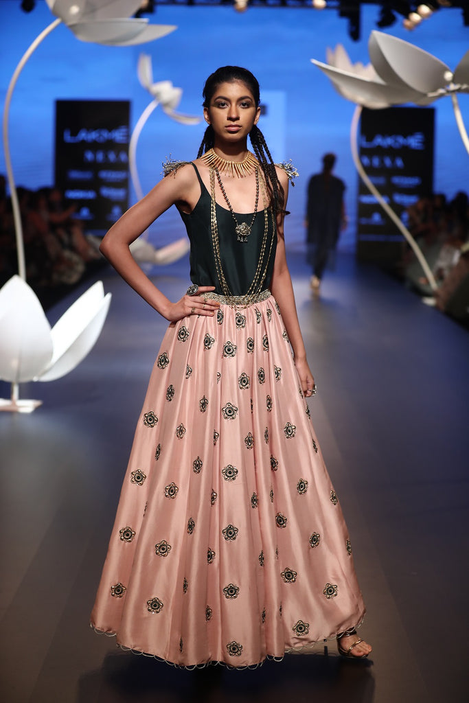 Emerald silk top with shoulder embellishments with rose pink silk clove embroidered skirt