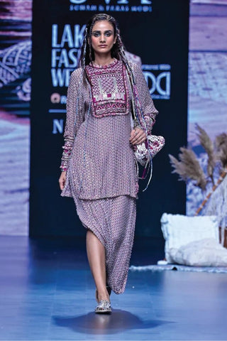Featuring a merlot geometric printed embellished yoke kurta paired with drape skirt