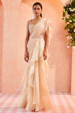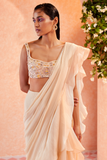 Dusty ivory net embroidered blouse and chiffon-organza draped ruffle saree and embroidered belt.