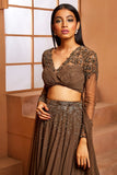 Military Green embellished full sleeve blouse with ruched bodice & embellished lehenga.