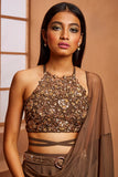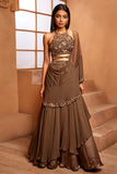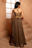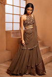 Military Green Asymmetrical Georgette And Satin Georgette Lehenga W/ Attached Embellished Drape And Gold Florette Embellished In Cut Blouse.