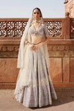 - ANTIQUE WHITE-BASED, MULTICOLOURED LEHENGA WITH INTRICATE FOLIAGE AND ARCHITECTURAL MOTIFS ADORNED WITH SEQUINS, CRYSTALS AND BEADS. THE LEHENGA IS STYLED WITH A CROPPED BLOUSE HAVING TASSEL DETAILS AND A TULLE DUPATTA