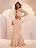 Light peach fishtail georgette skirt with a self 3D hand embellished net blouse & open tie back