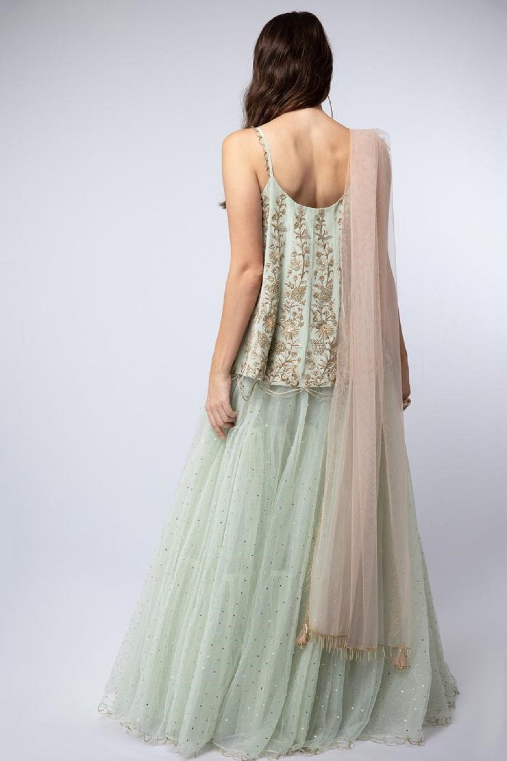 Designer Payal Singhal: Mint embroidered short anarkali set with mukaish lehenga, scalloped blouse, and matching dupatta.
