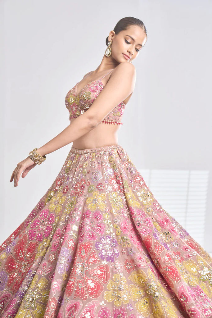 This coffee net lehenga features bright floral applique motifs along with the sprinkling of sequin and crystals. The strappy blouse and dupatta are full embroidered.
