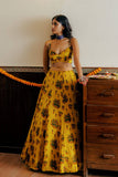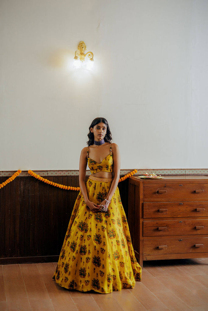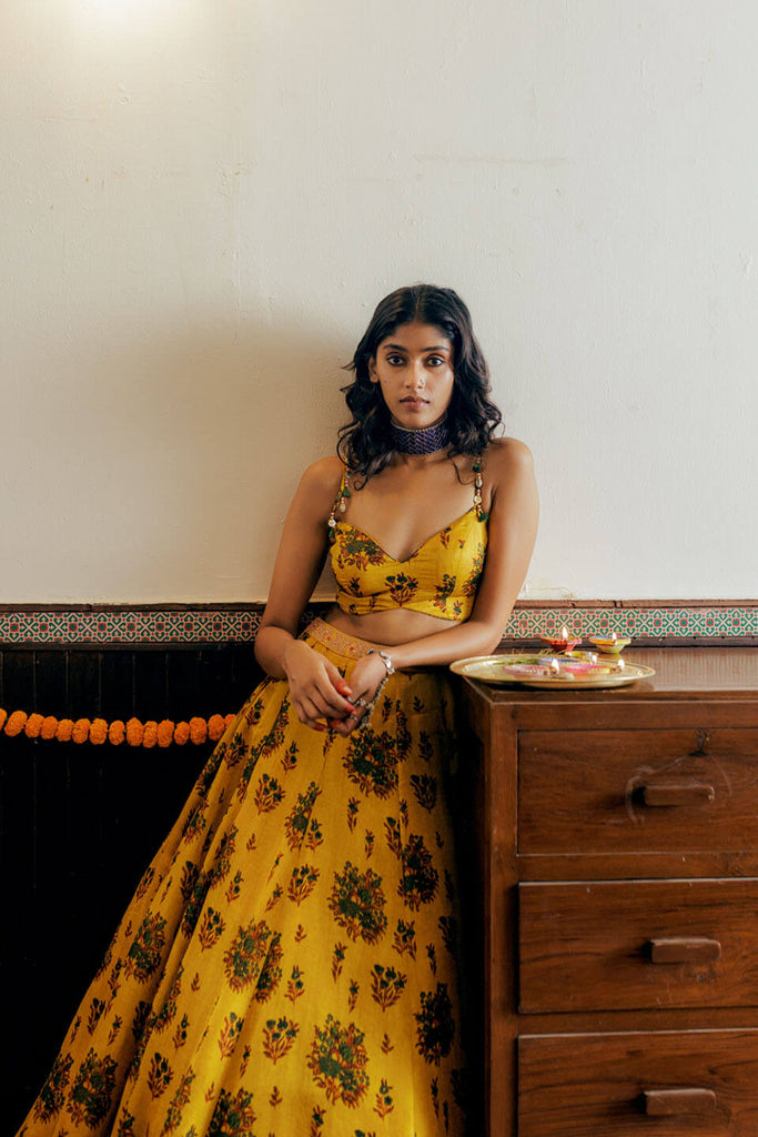 Statement Label Anushree lehenga in a fresh Nandi mughal print with a marodi work waist belt and bohemian tassel detail on the strap