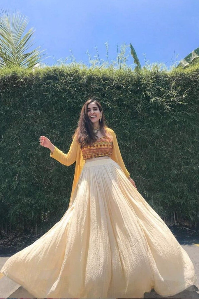Label Anushree : Yellow embroidered bustier with a off white skirt & a kota cape.