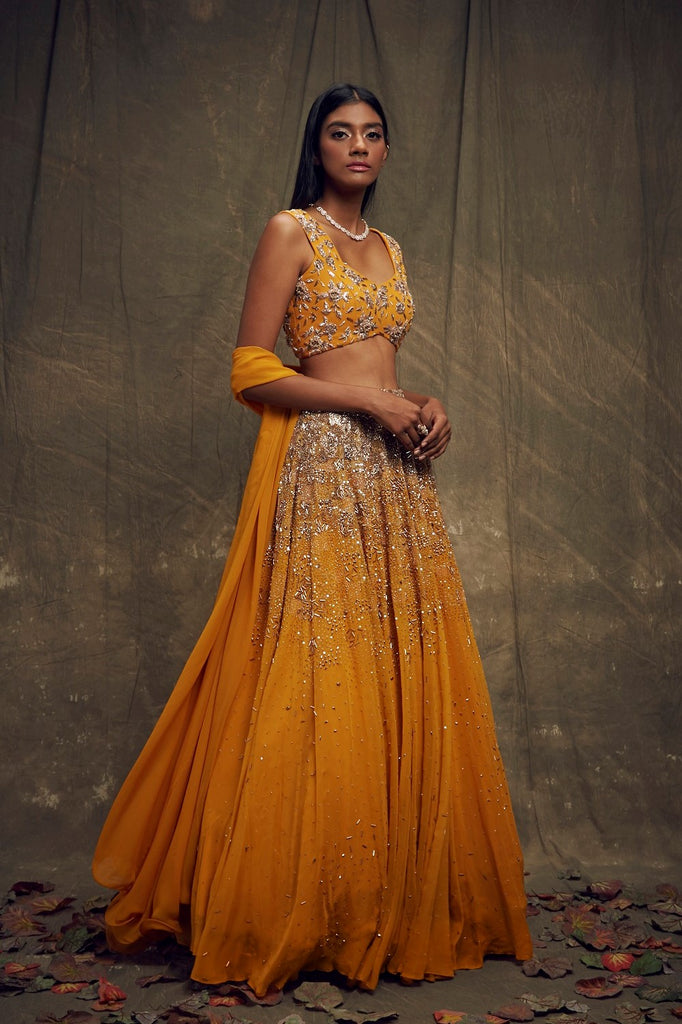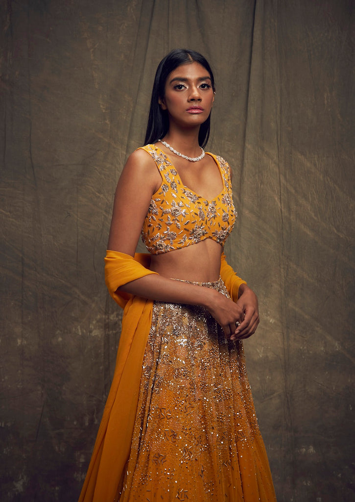 Mustard sleeveless embellished lehenga set with wire beaded georgette dupatta.