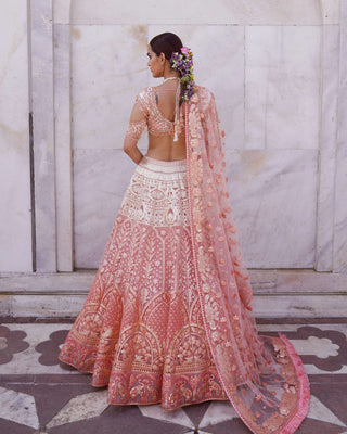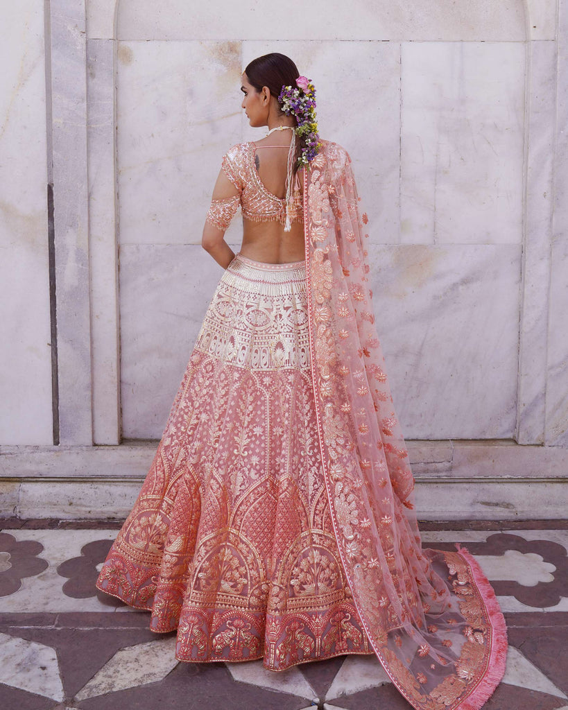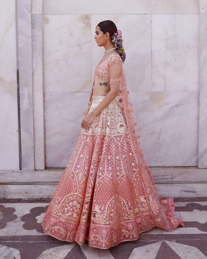 - CORAL, OMBRE LEHENGA WITH FOLIAGE, ANIMAL AND ARCHITECTURAL MOTIFS IN LIGHT GOLD CHROME APPLIQUE. THE LEHENGA IS STYLED WITH A CROPPED, CUTOUT BLOUSE WITH TASSLE DETAILS AND A TULLE DUPATTA WITH THREADWORK FRINGED-BORDER.