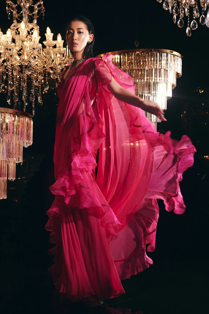 Bright fucshia thread embroidered net blouse with Chiffon organza Double draped ruffle saree