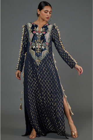 NAVY DASH IKAT BANARASI GEORGETTE EMBROIDERED YOKE KAFTAN WITH ORGANZA DETAILED SLEEVES Sale price$560