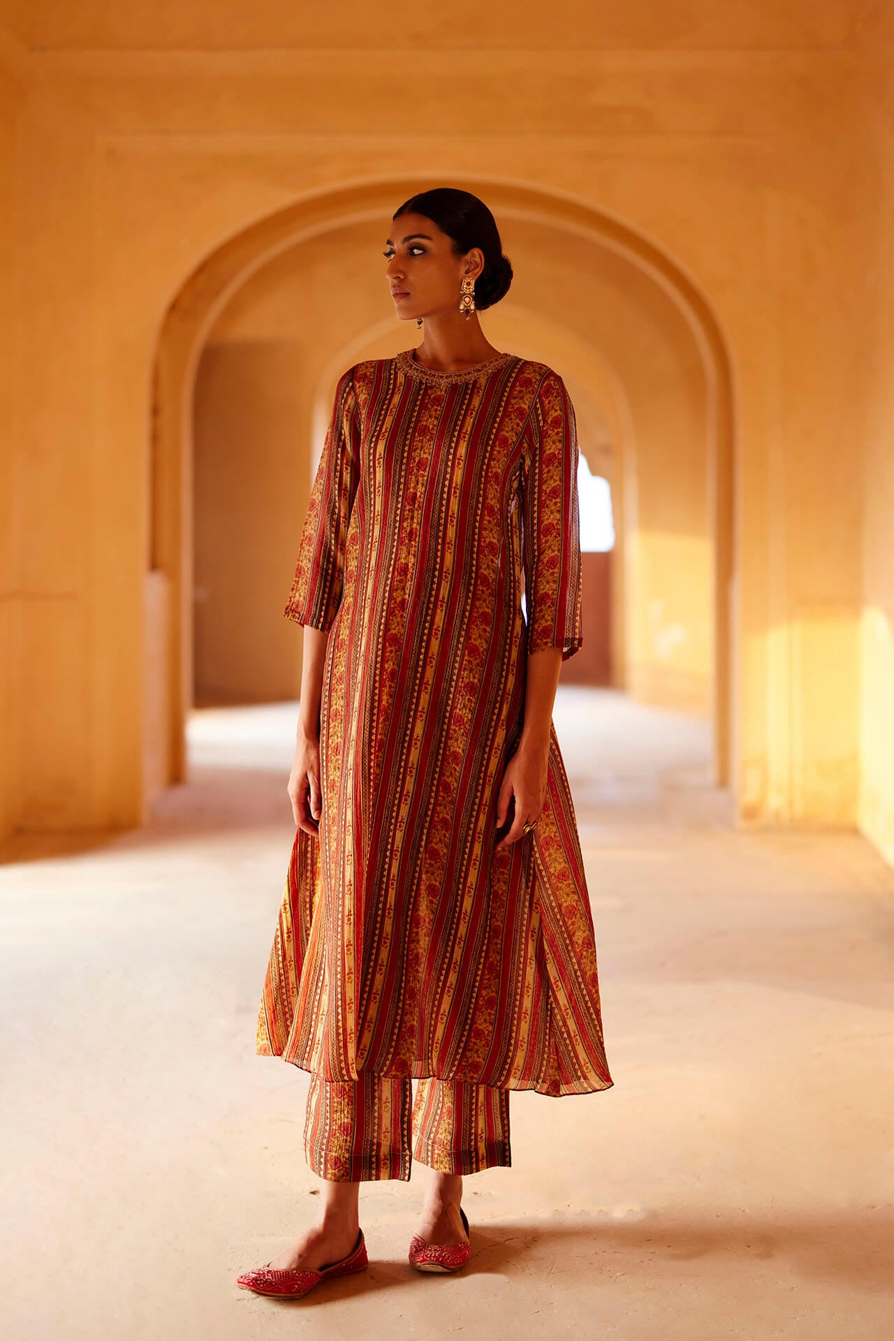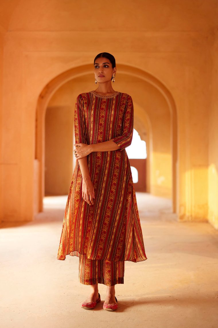 Classic coord set in a beautiful beige & red stripe print with floral detailing & marodi work neckline.