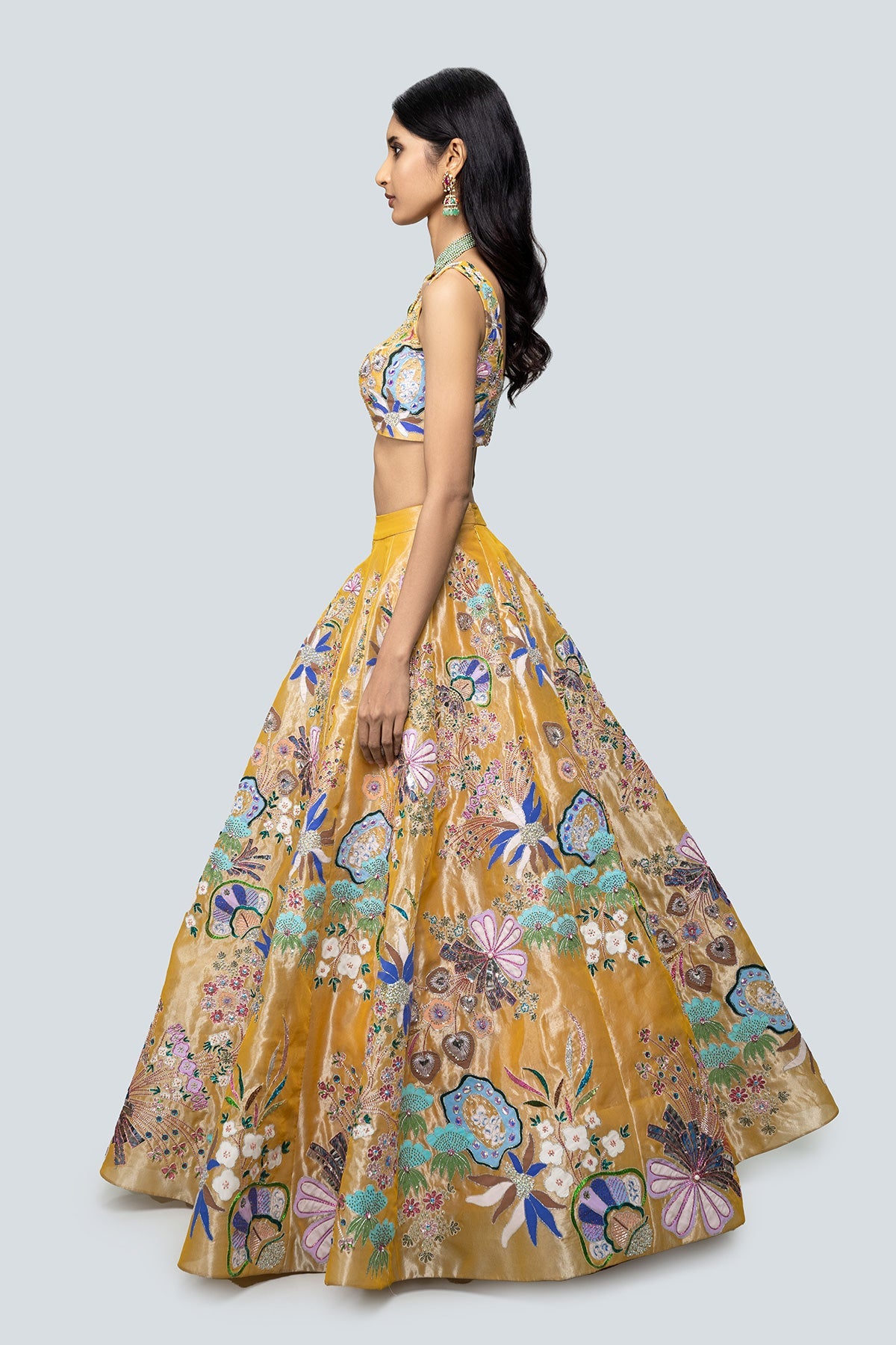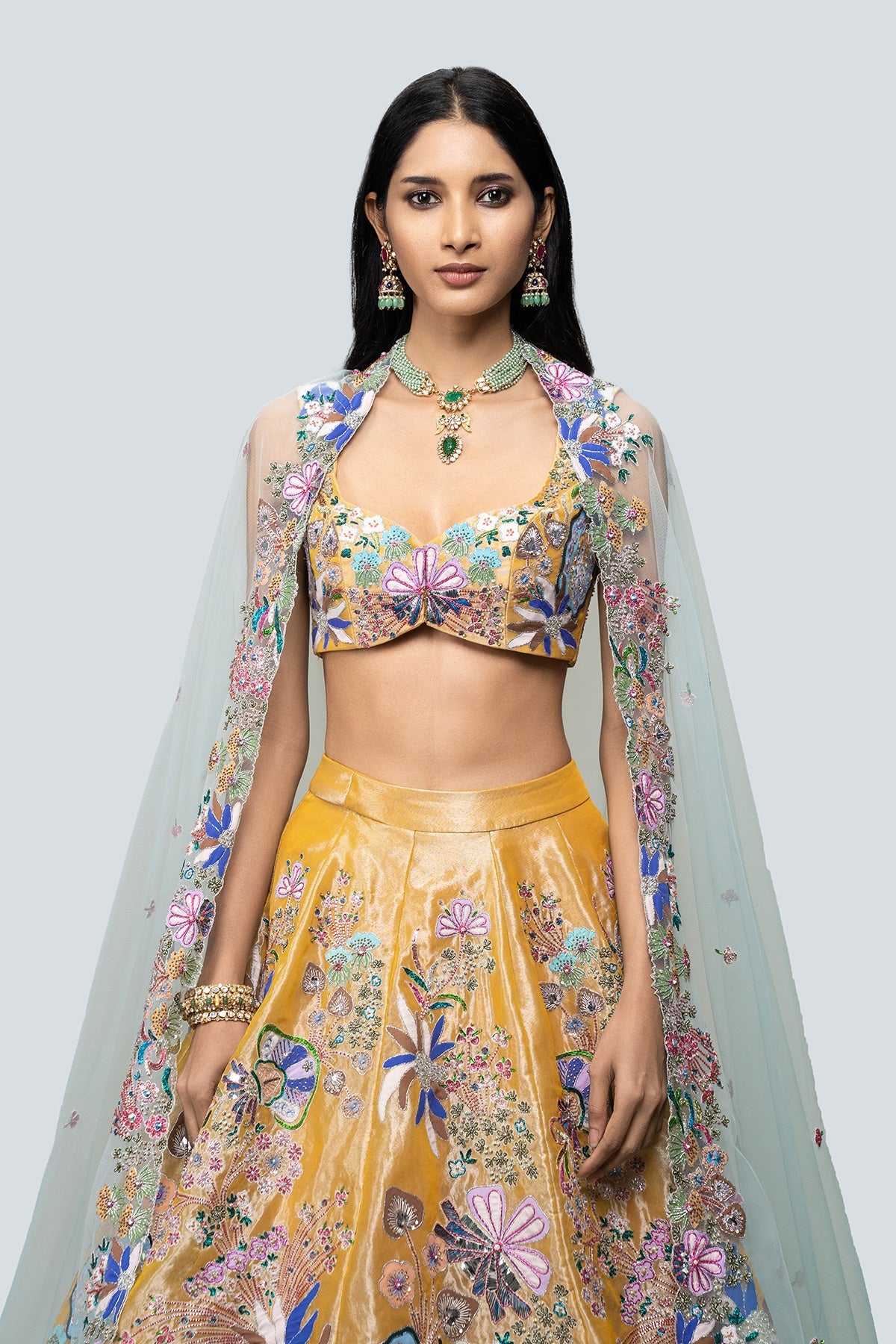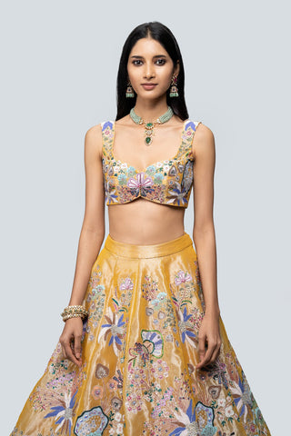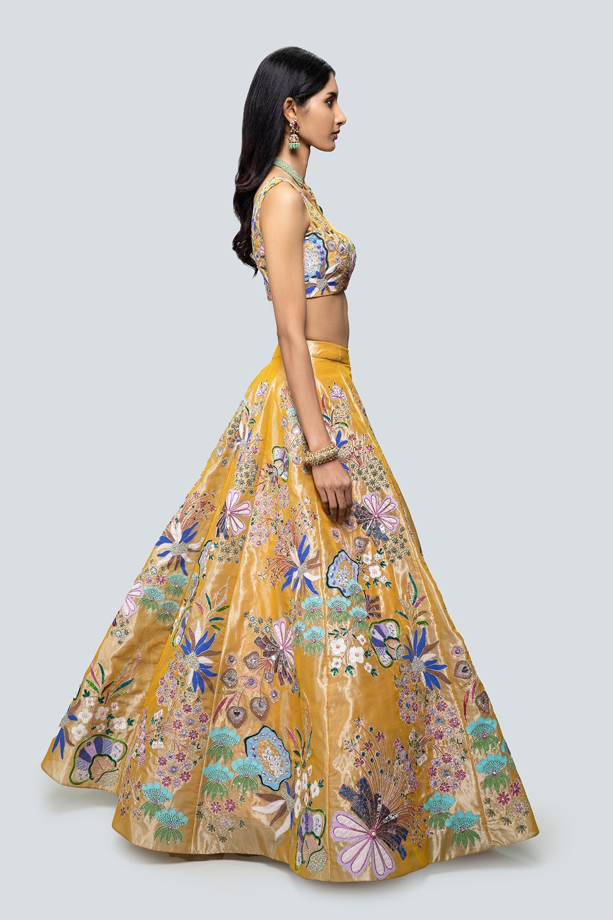 Multicoloured Amber applique and embellised kali tissue lehenga with sleeveless blouse and floral border net dupatta.