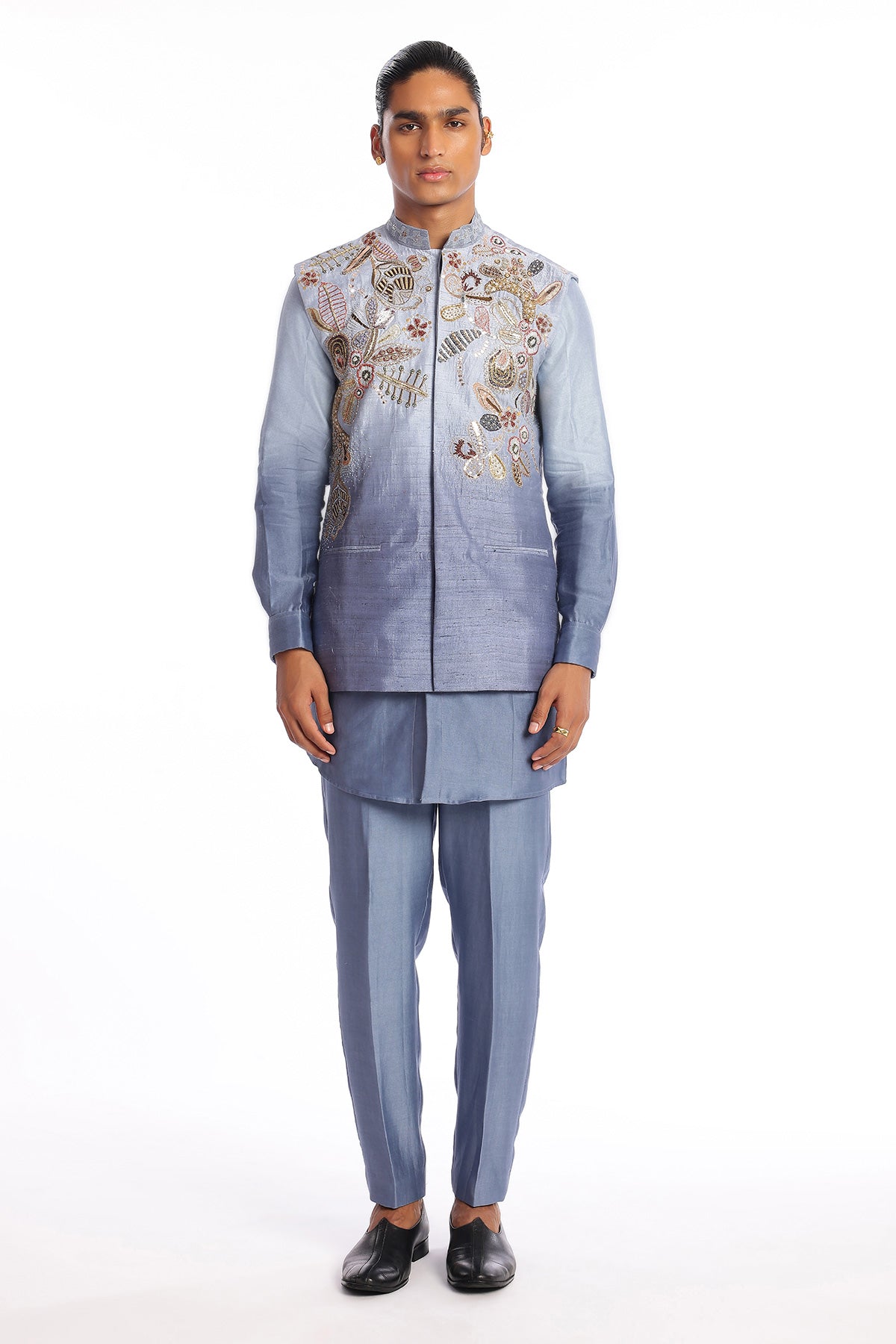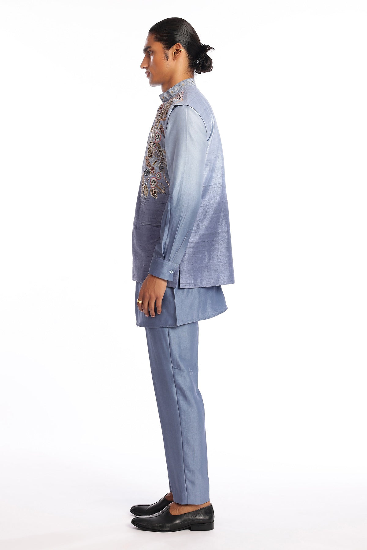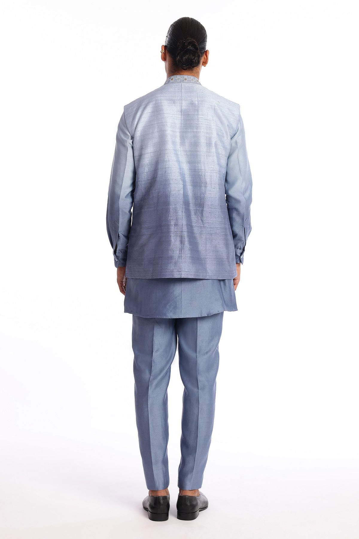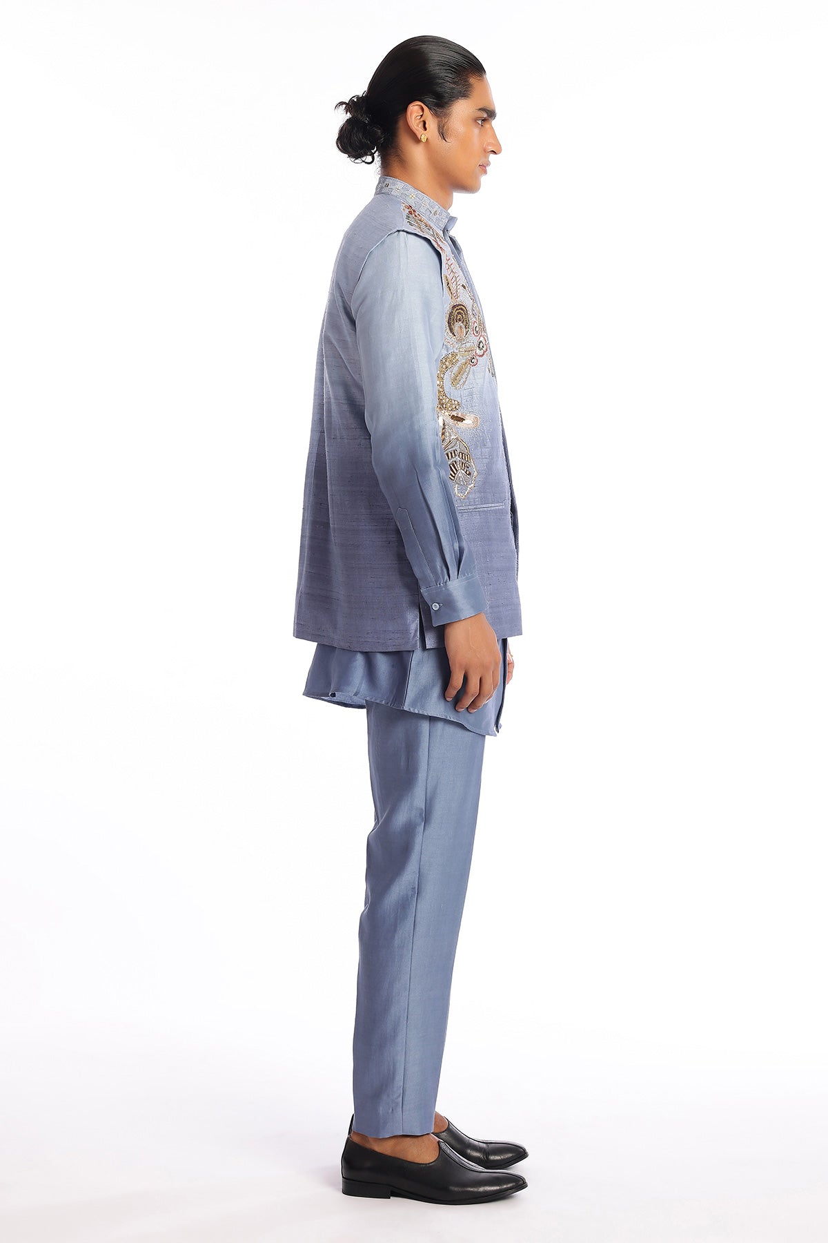 Pewter blue embellished raw silk bundi with chanderi silk kurta & straight pant