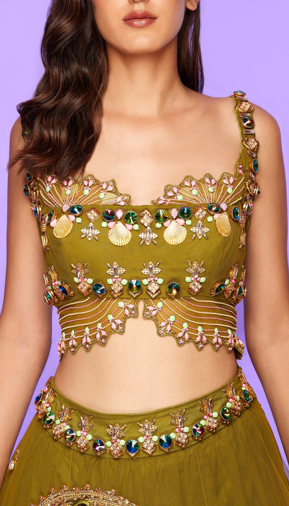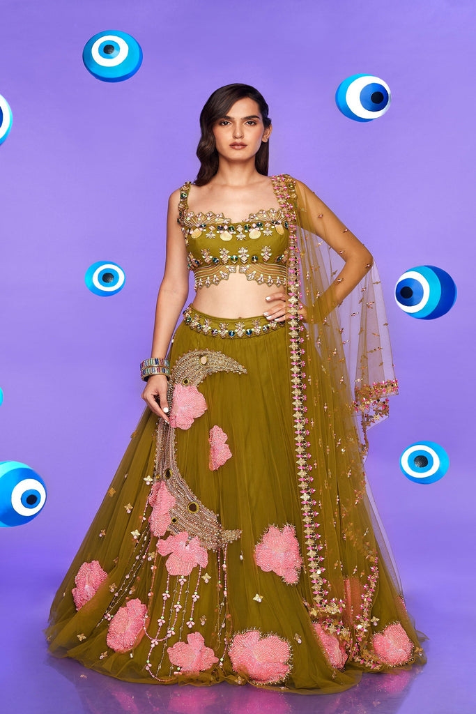 A tulle Lehenga in olive embellished with glass beads, metals, sequins and 3D embroidered flowers. Paired with an olive blouse with tulle embellished sleeves and a tulle dupatta.