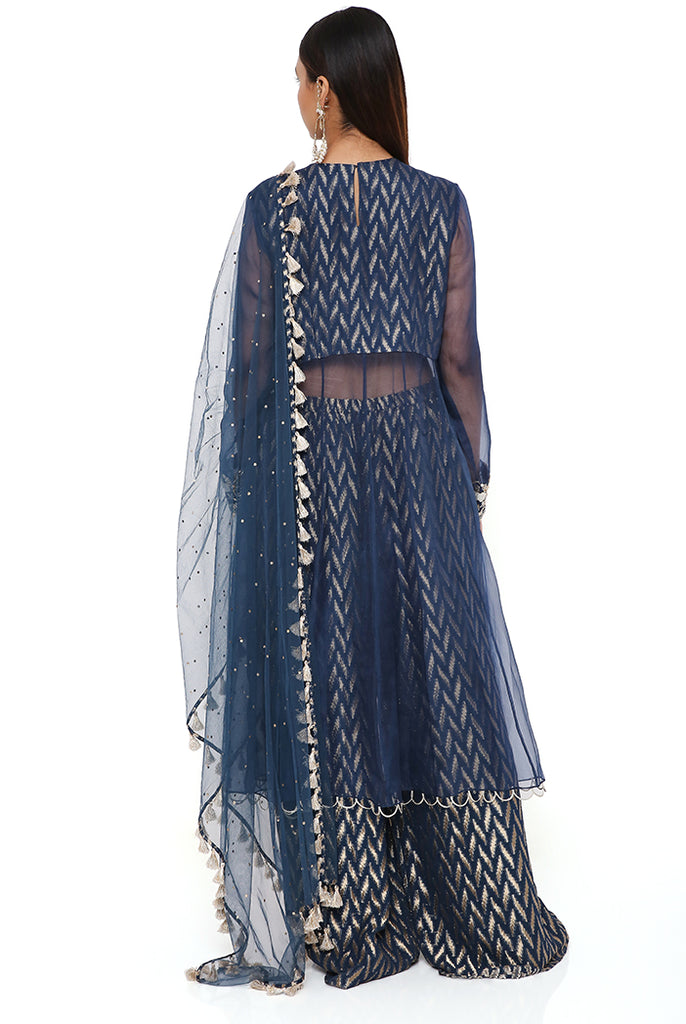 Navy organza embroidered yoke anarkali with dash ikat banarasi georgette palazzo and mukaish net dupatta.