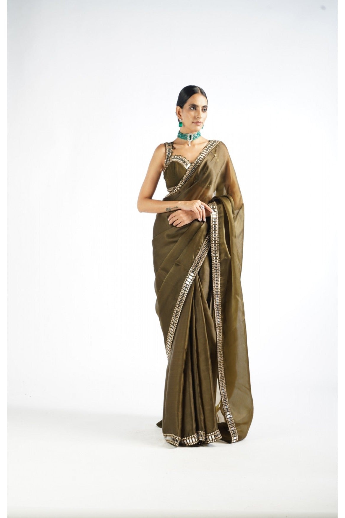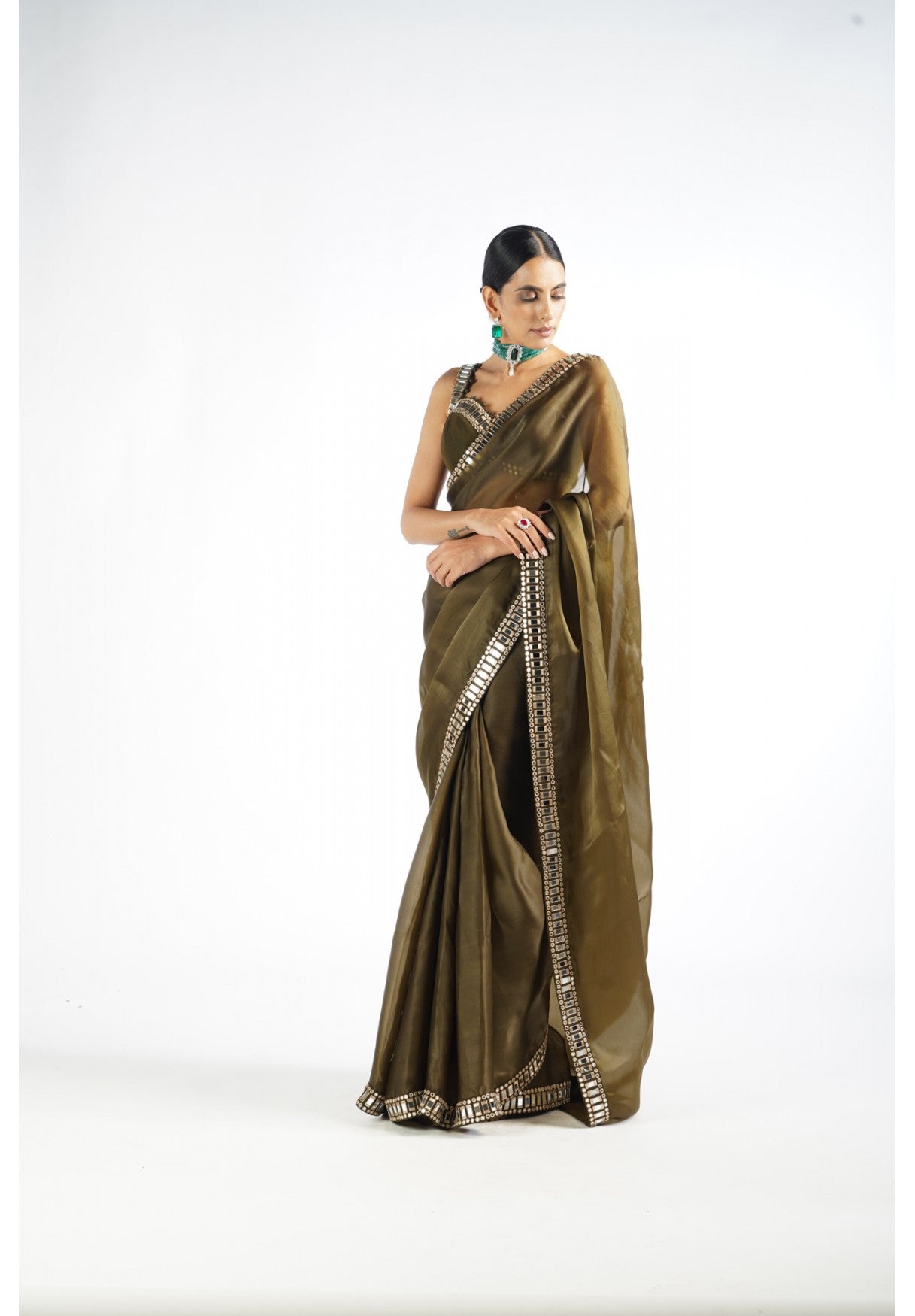 Satin organza saree with real hand cut mirror border and a mirror hand work blouse.