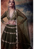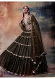 Hand Embroidered mughal boota v-neck blouse with a sequin splash tier lehenga and a net dupatta with mirror scallop border