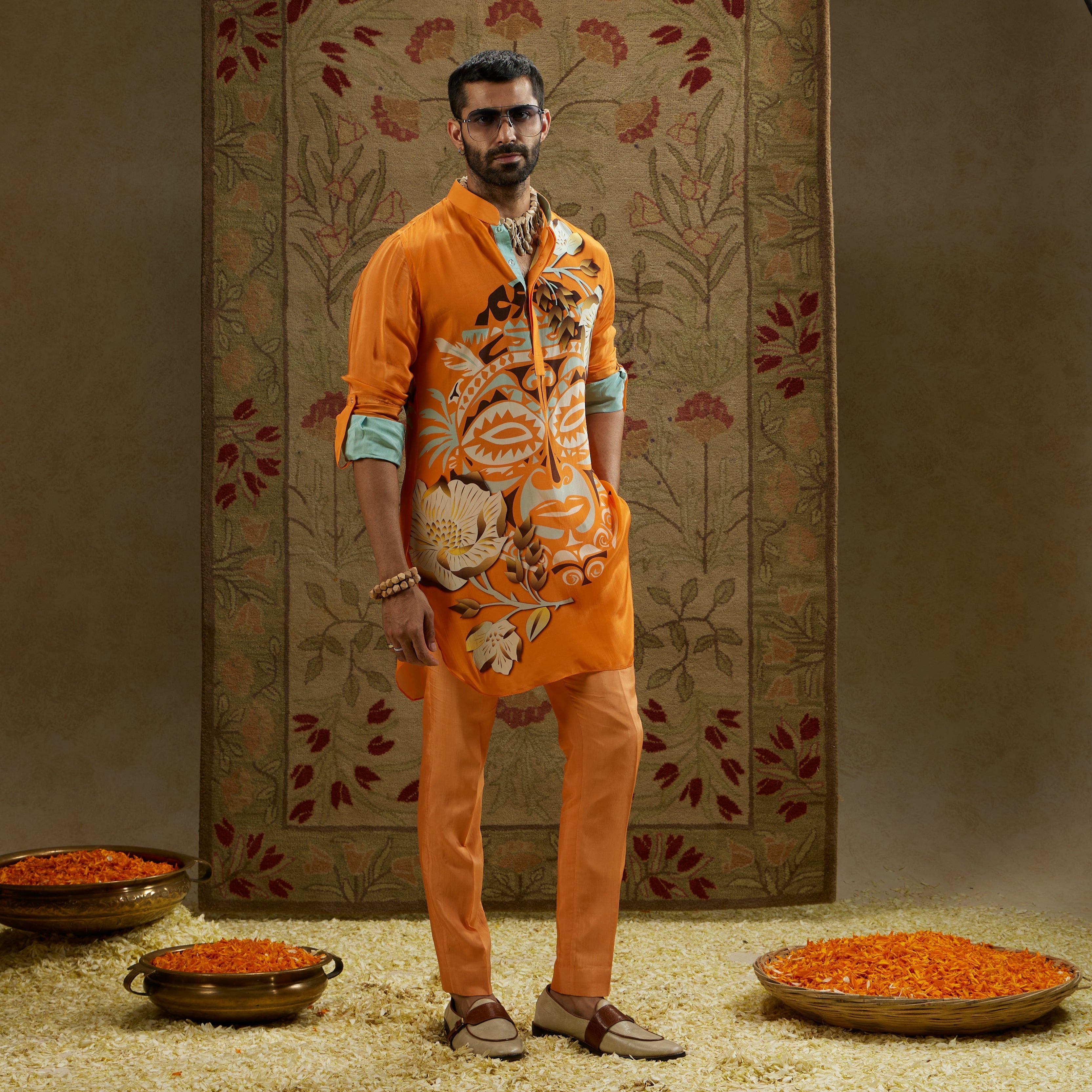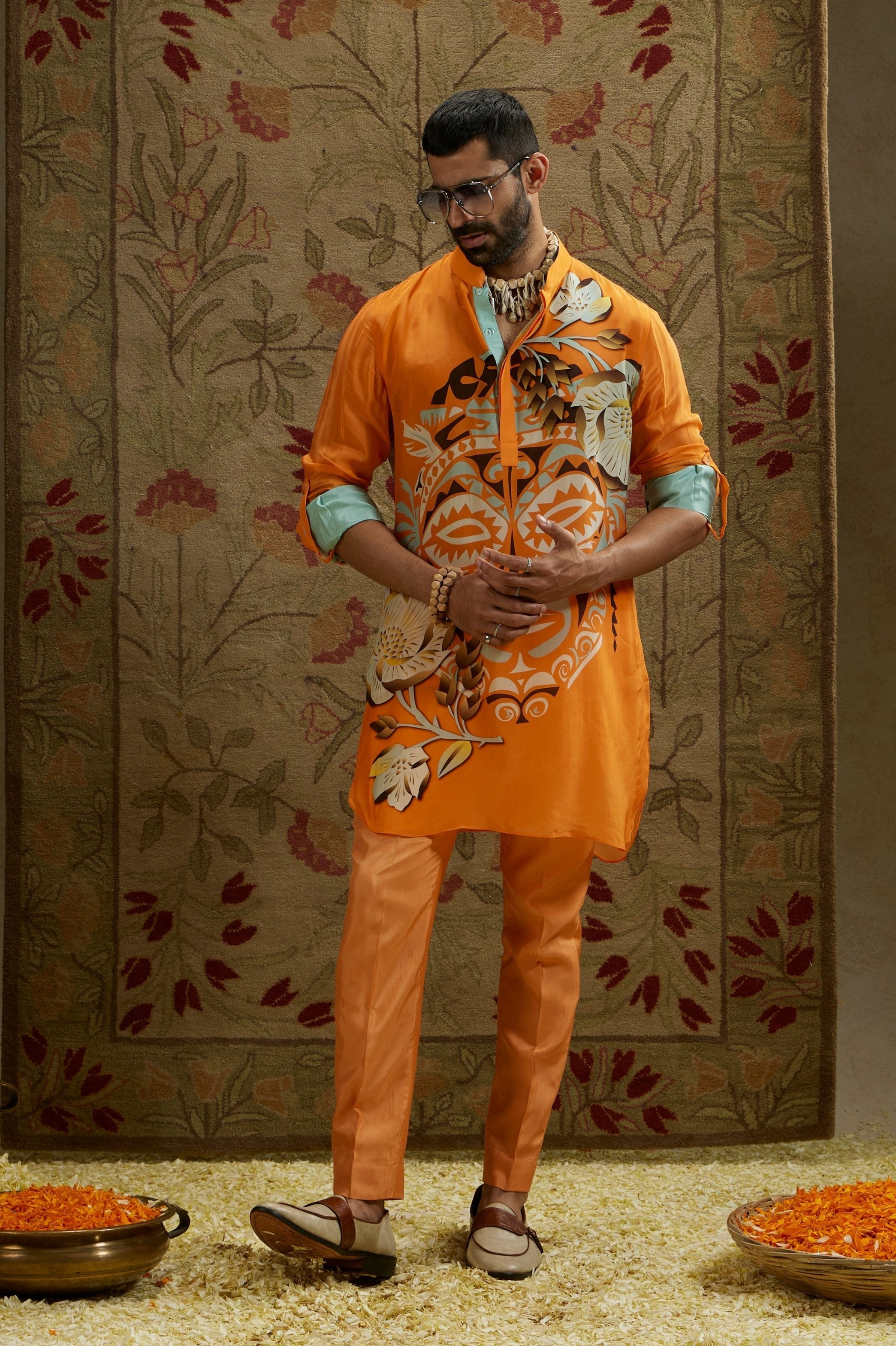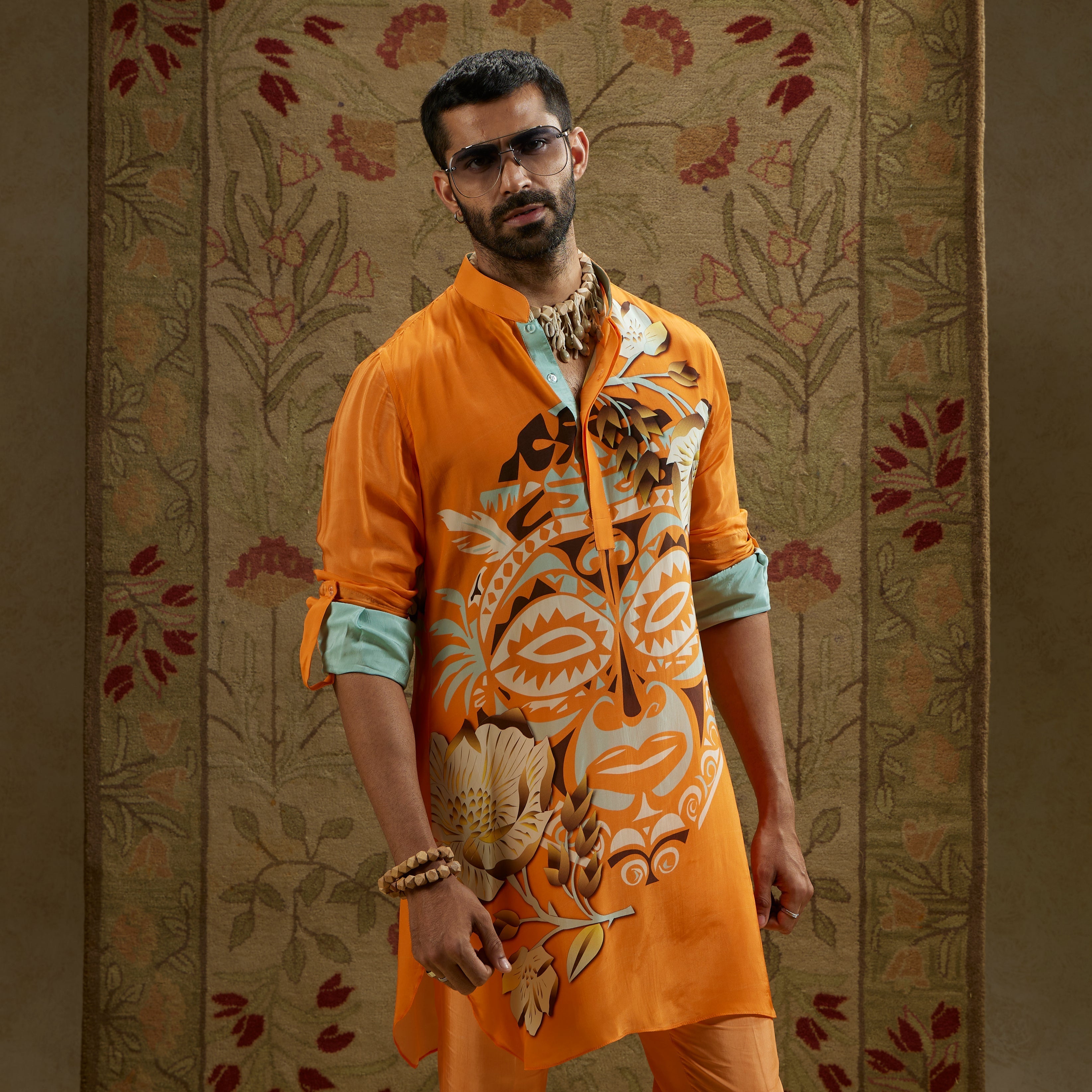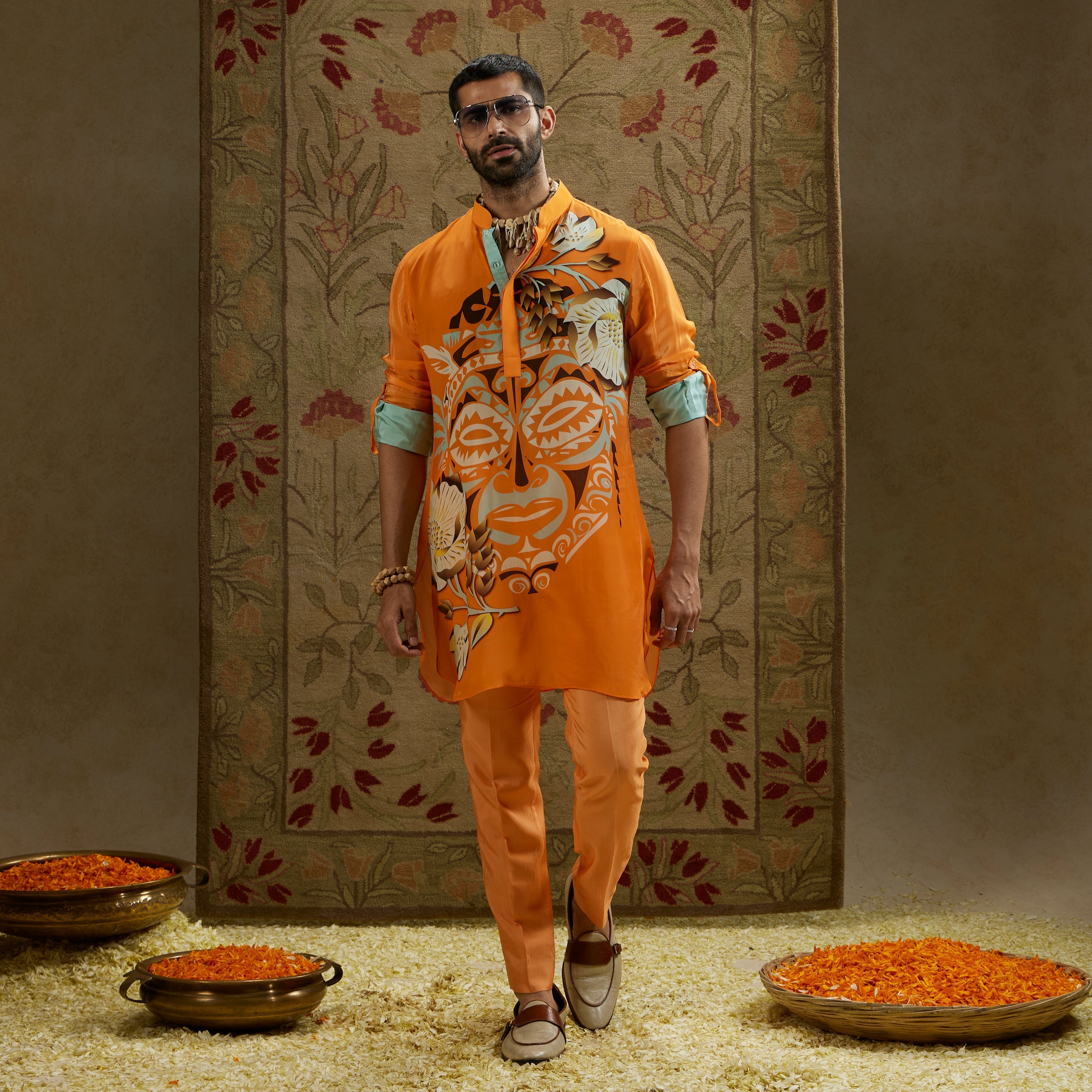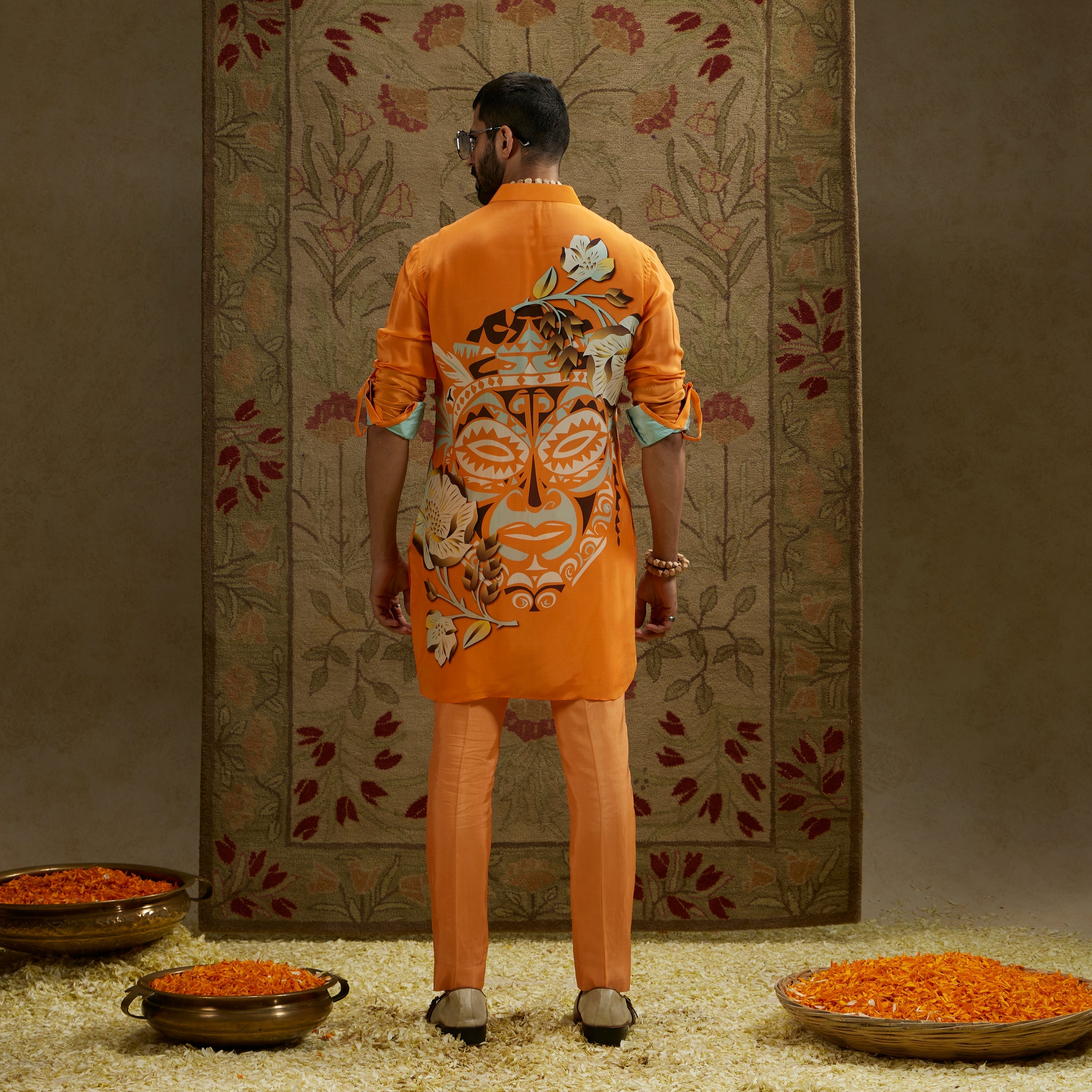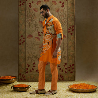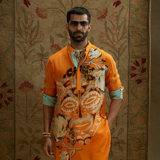 Featuring a orange mask print rolled up sleeves kurta.