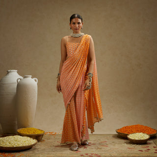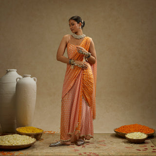 Orange pink ombre print cascade saree with bustier
