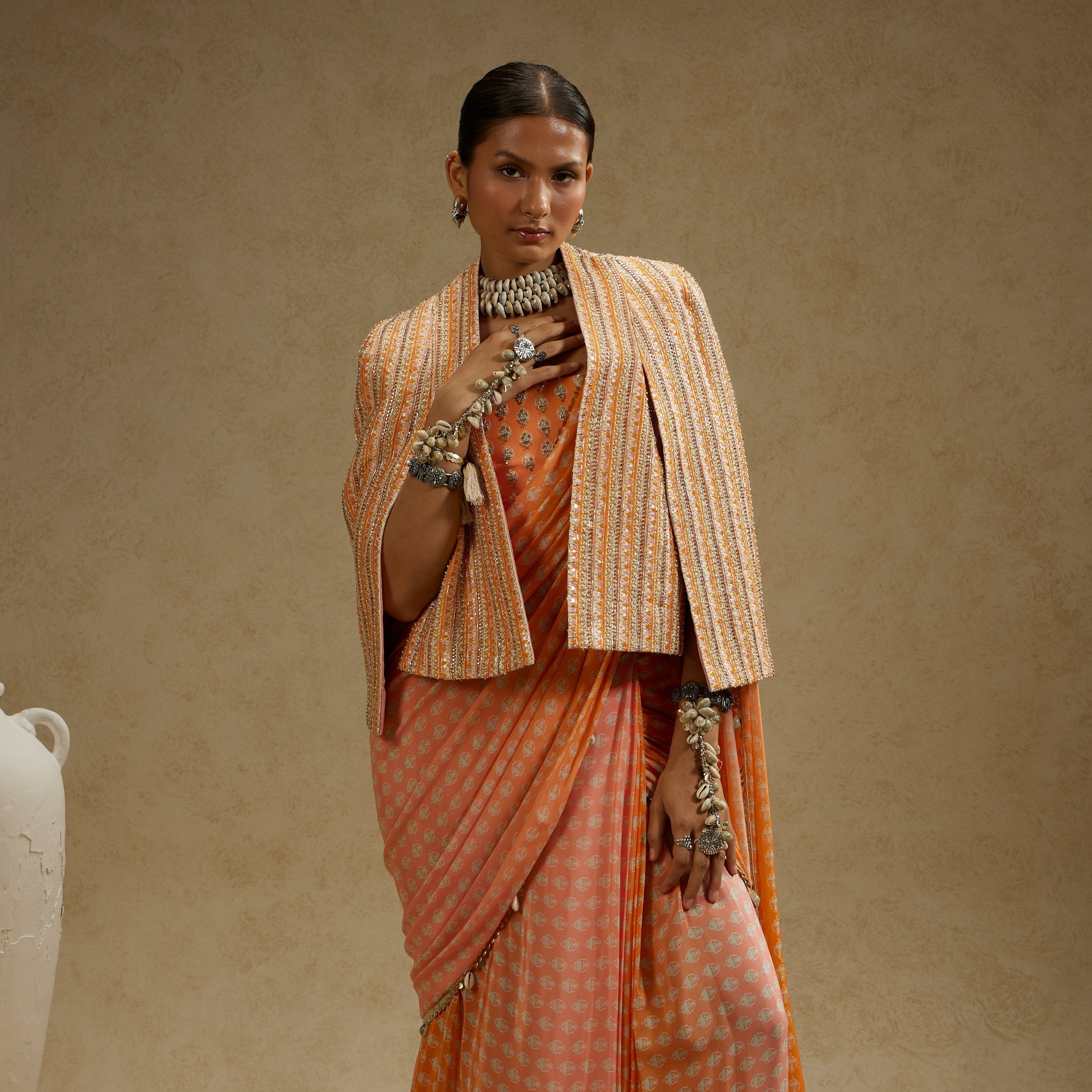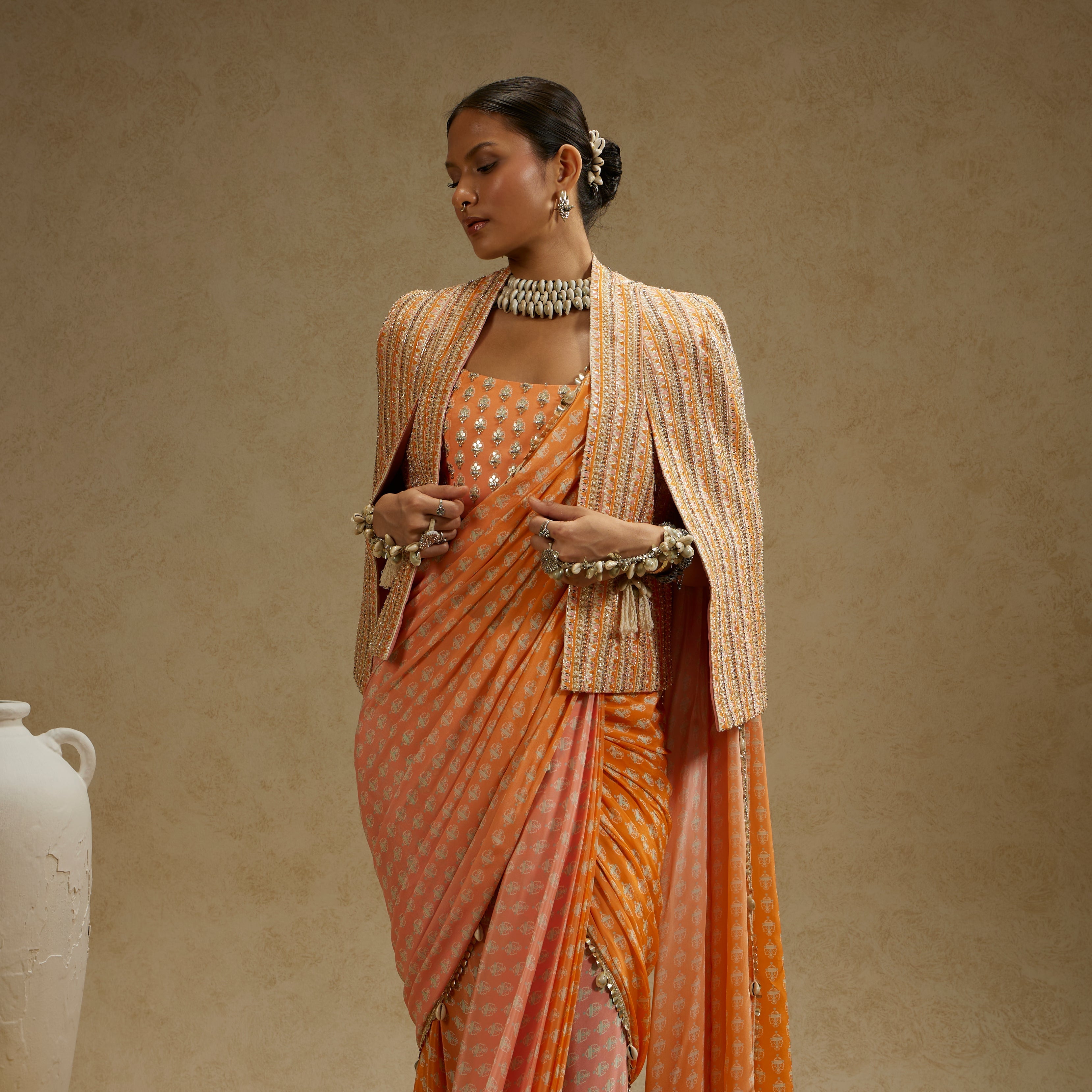 Orange pink ombre print cascade saree with bustier & embellished noor jacket