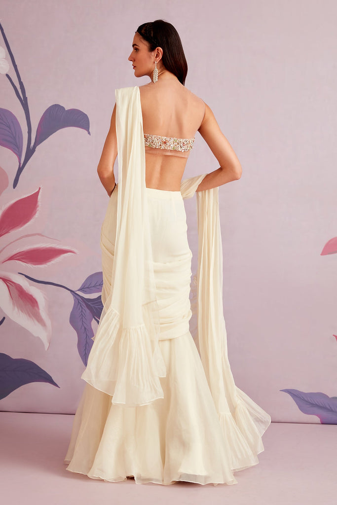 Embroidered net blouse with chiffon draped saree paired with embroidered belt