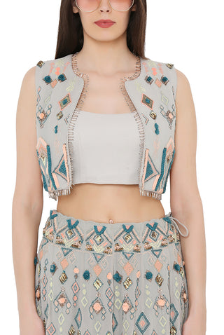 Designer Payal Singhal: Pale blue colour georgette embroidered short jacket with tassel detailing and lehenga with georgette bustier