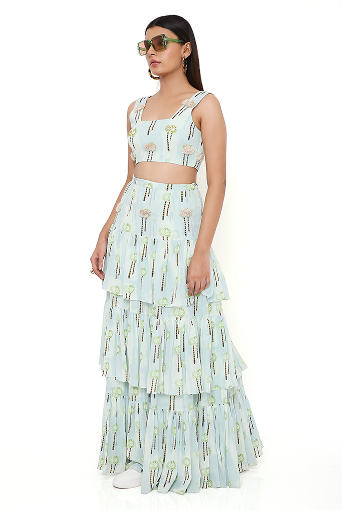 Pale blue small palm georgette printed embroidered top with embroidered frill skirt.