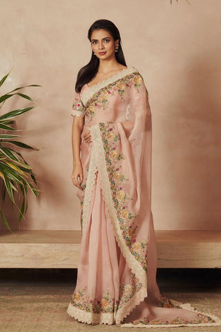 PASTEL PEACH ORGANZA MULTITHREAD AND DORI EMBROIDERED BAANKI K SAREE WITH RAWSILK UNSTITCHED BLOUSE FABRIC