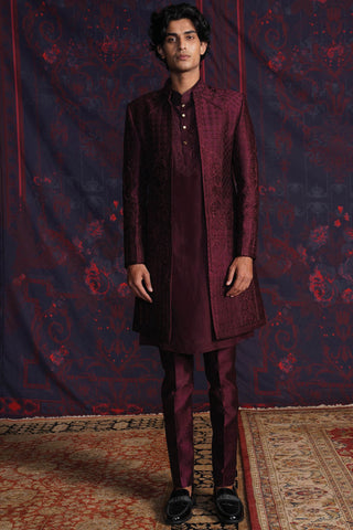 - DEEP RED SHERWANI WITH A KURTA AND PANTS