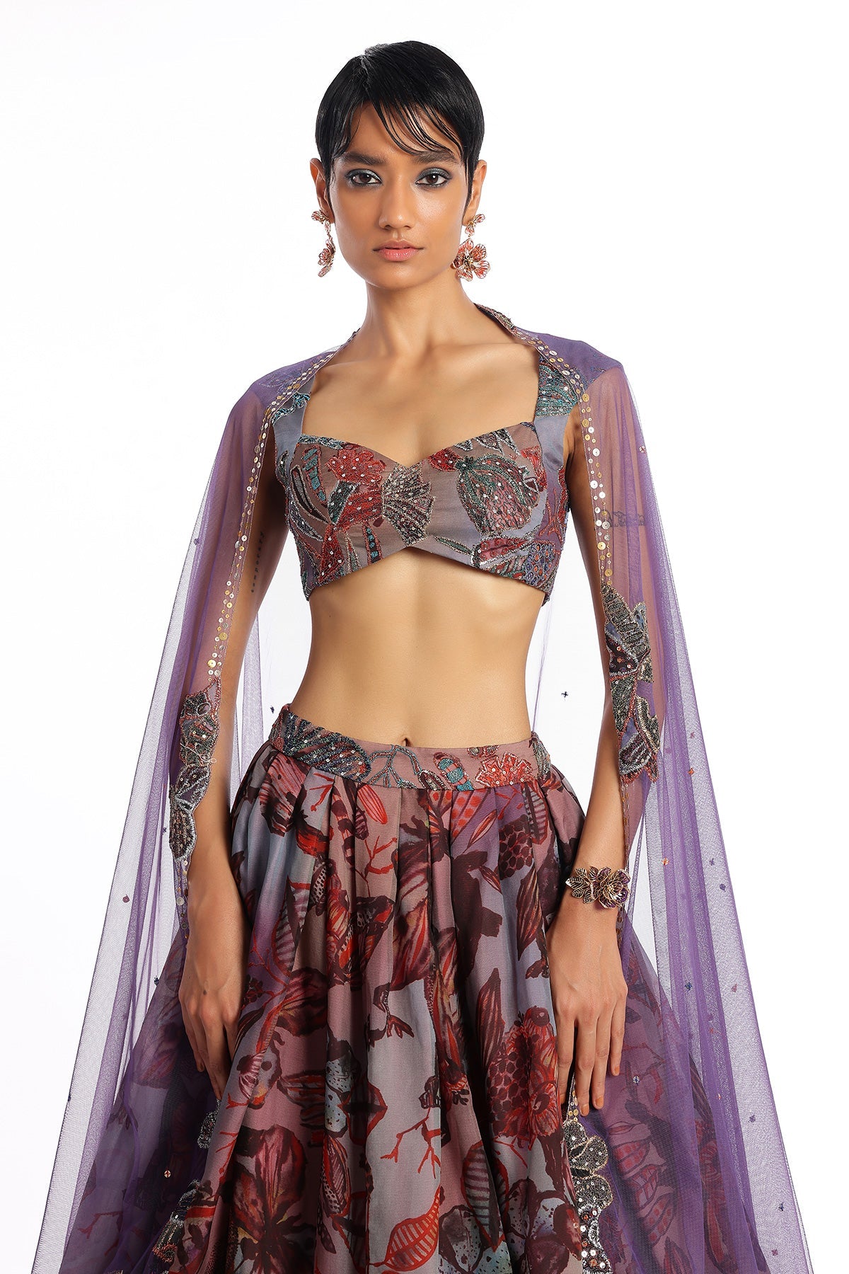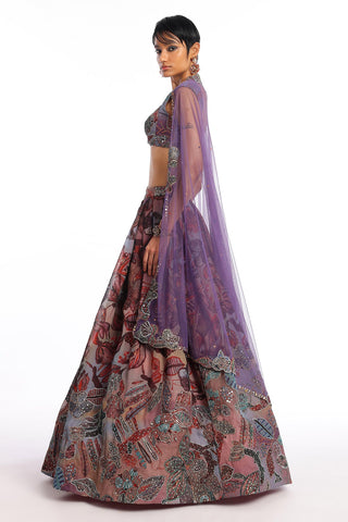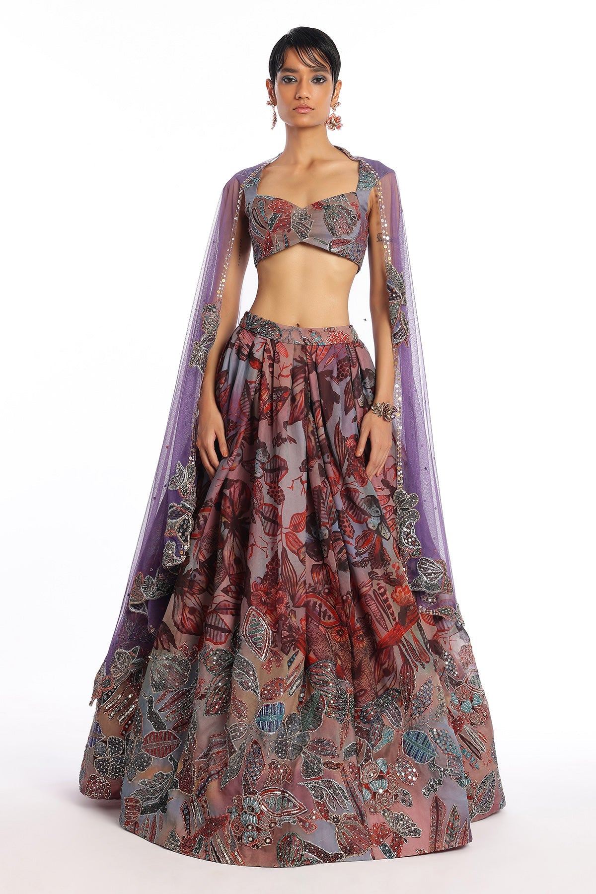 Kinfolk catawba printed applique embellished organza lehenga and blouse with tulle dupatta