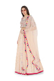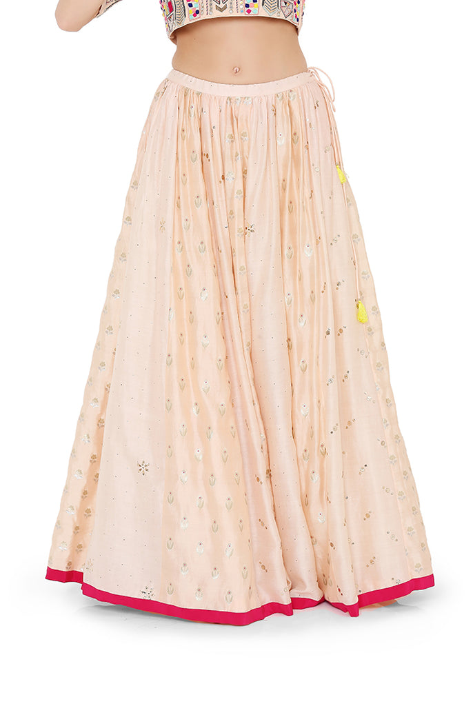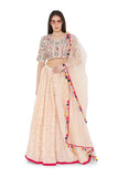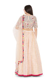 Designer Payal Singhal: PEACH COLOUR GEORGETTE CHOLI WITH MULTI BROCADE AND MUKAISH SILKMUL PANELLED LEHNEGA WITH NET DUPATTA