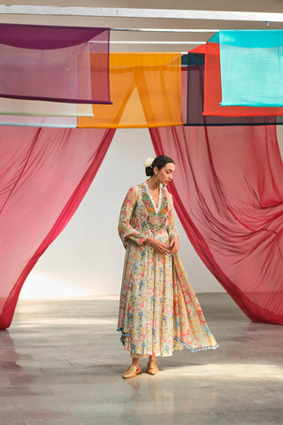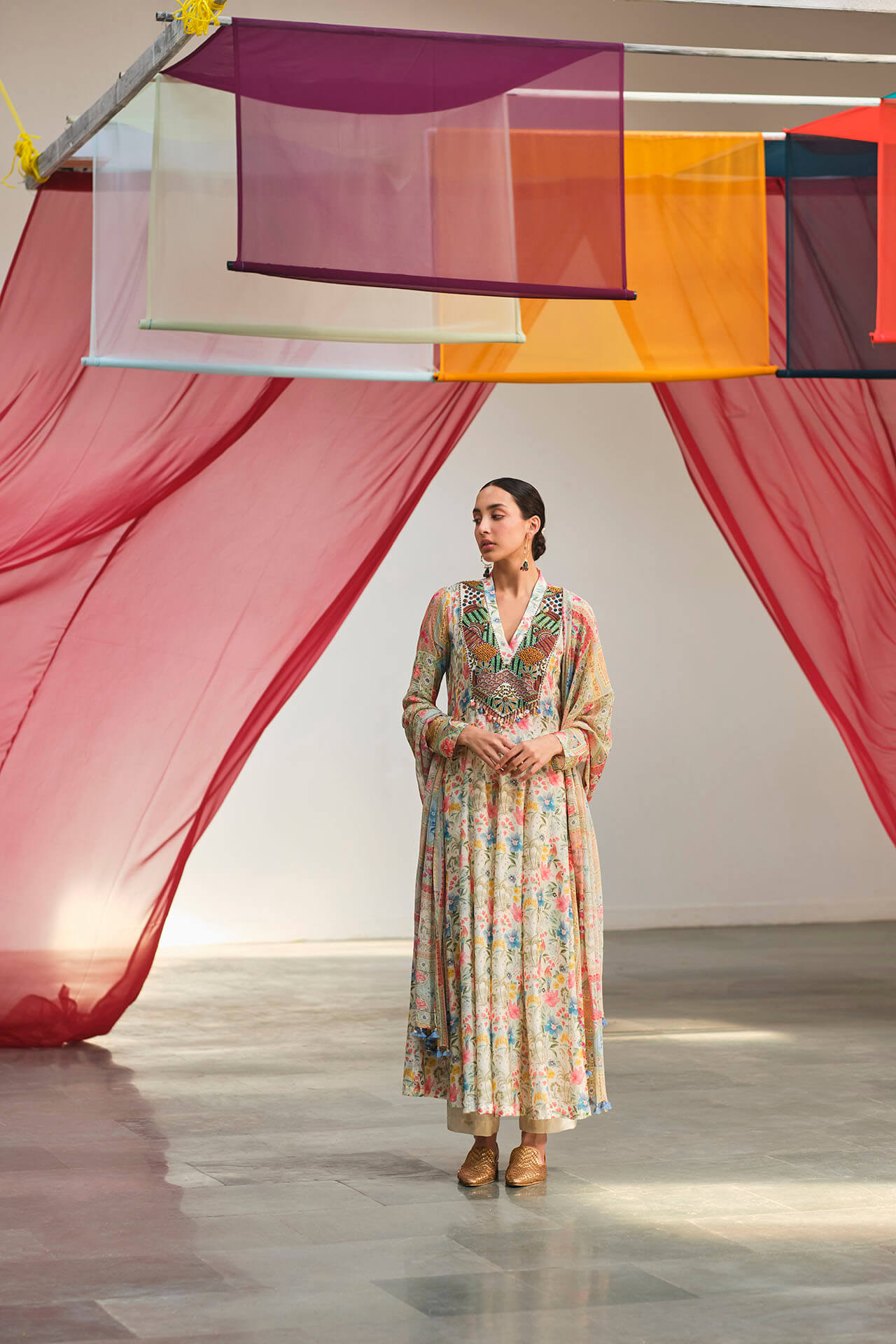 Hand beaded floral printed panelled kurta with offwhite chanderi silk gold butti pants and a printed dupatta