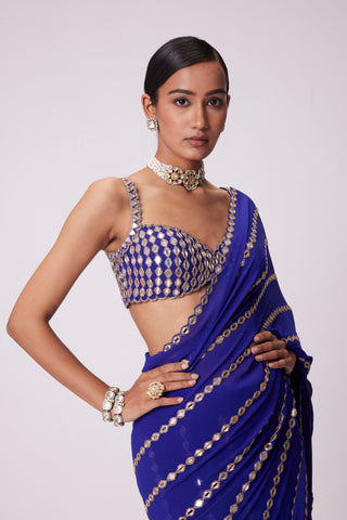 Persian blue Linear Mirror hand embroidered Georgette Saree clubbed with real hand cut mirror embroidered sleeveless blouse.