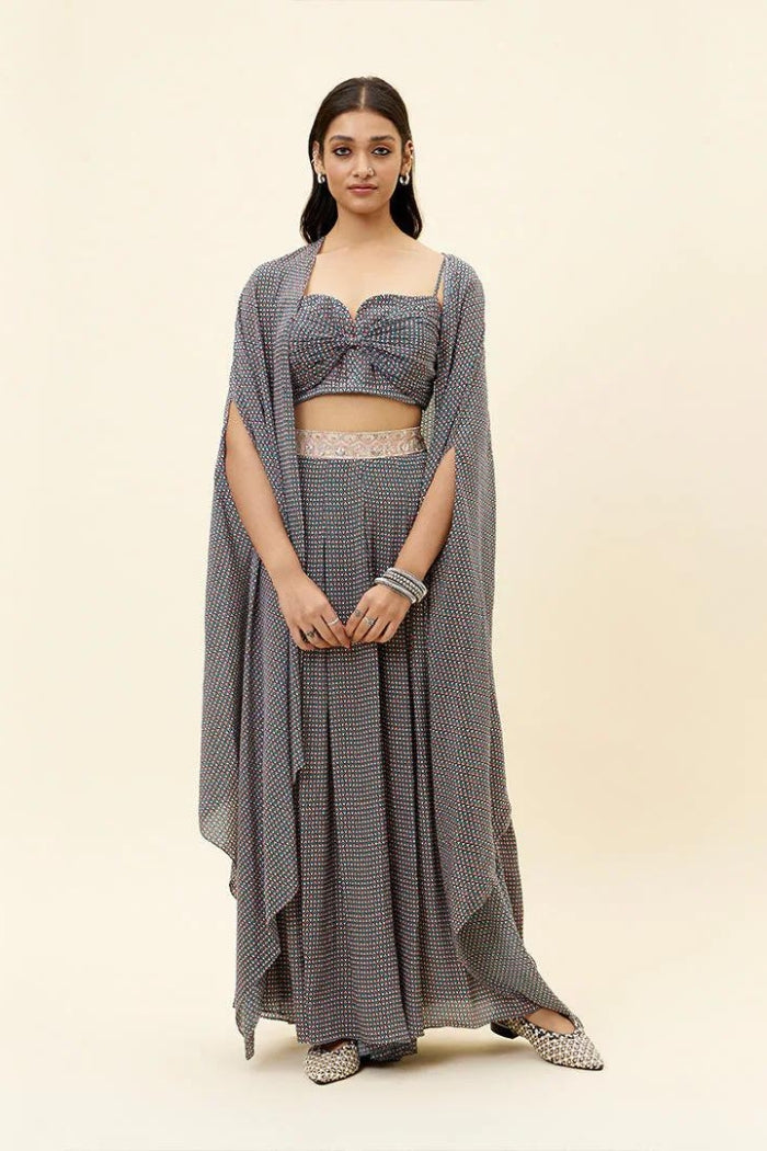 PINK BUTTI PRINT BOX PLEATED PANTS WITH BIKINI BUSTIER AND CAPE Sale price$235
