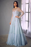 Powder blue gold & champagne thread flower embellished full sleeves anarkali with a soft net tier along with a back buckle detail.