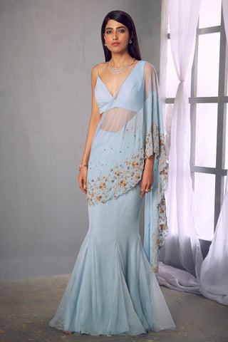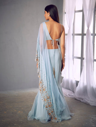 Powder blue fishtail skirt with an attached gold & bronze embroidered drape paired with an asymmetric blouse with tie up back.