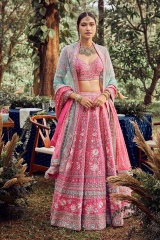 In alluring pink, the Prushti Lehenga is an embodiment of femininity and achieves a glistening dewy look with expert embroidery work by our master artisans with an exquisite composition of gota patti, along with dori, pearl, zardosi, sequins, and zari.