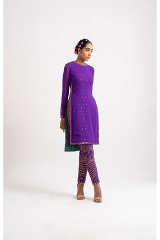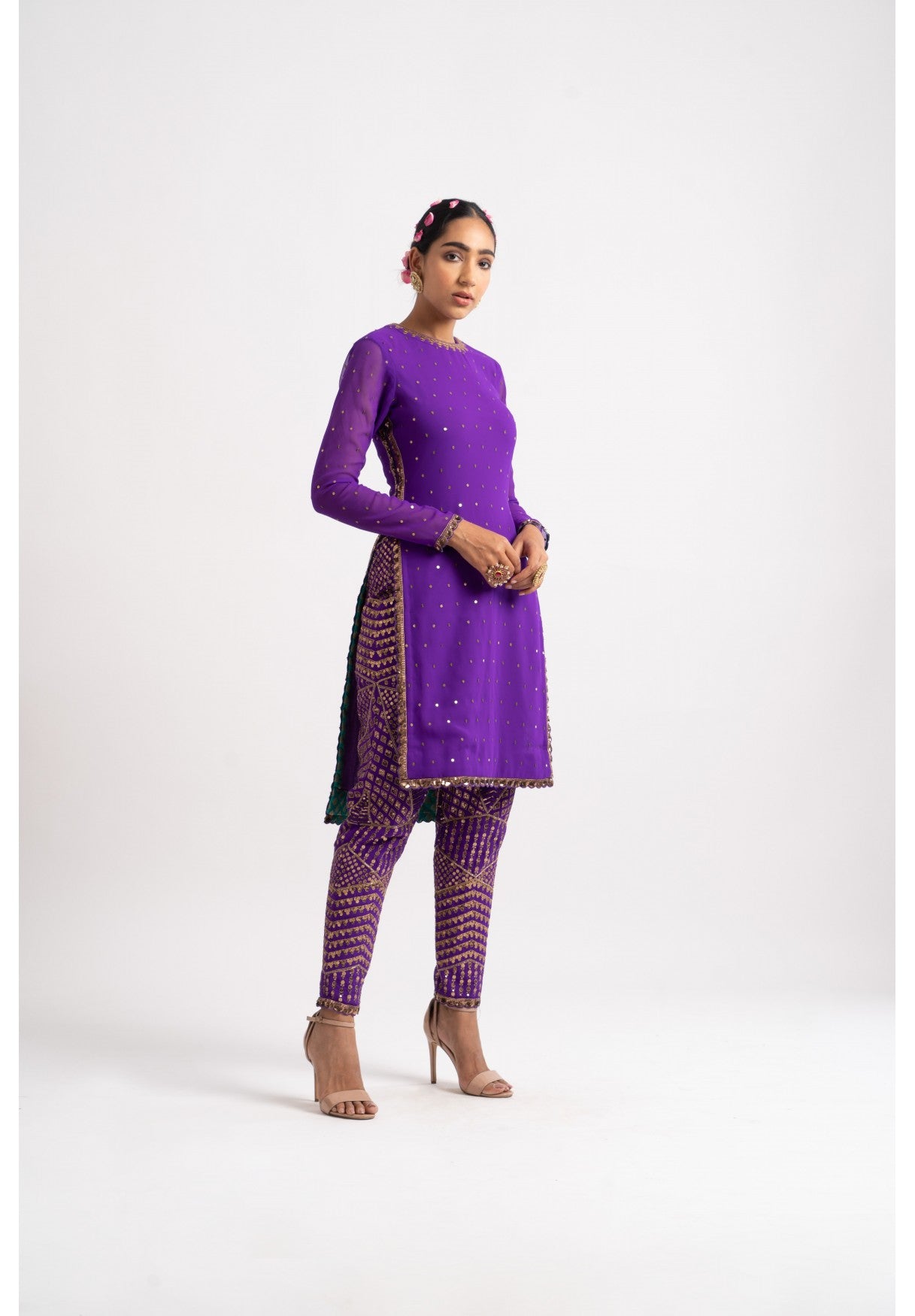 Intricately hand embroidered pants with sequins splash georgette round neck.