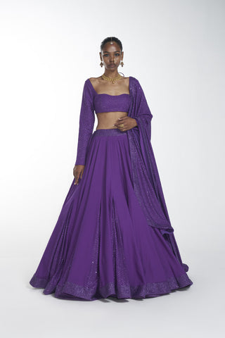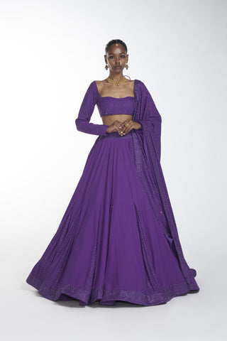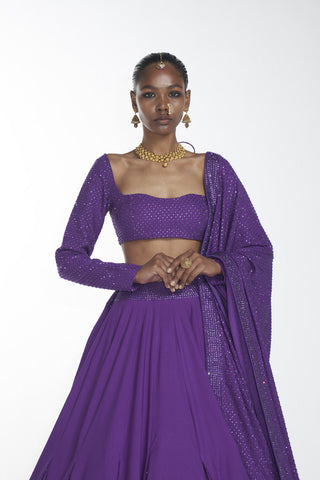 Tanzanite Lehenga & Square neckline sleeveless Blouse with Dupatta . All in Crystal embellished crepe fabric.
