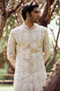 An intricately crafted silk sherwani with meticulous silk thread and jari work depicting floral botanical motifs from the gardens of royalty. Its Mandarin-style collars also feature minute hand embroidery, and comes with a front pocket.