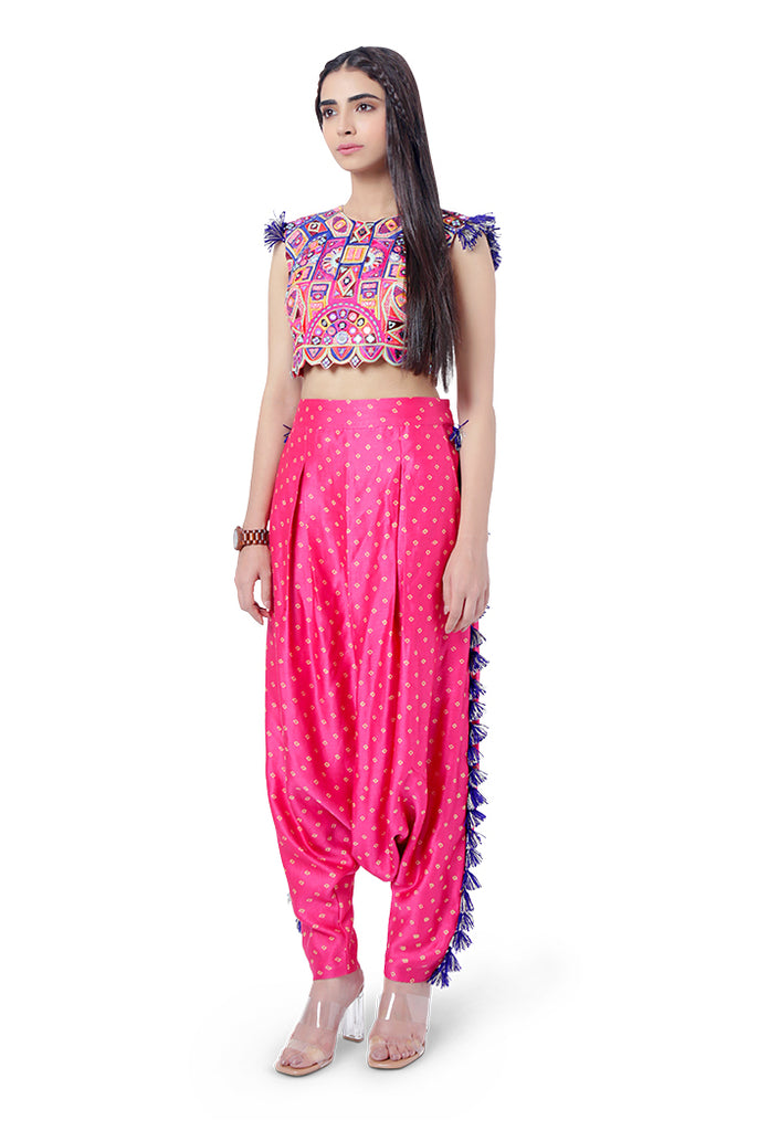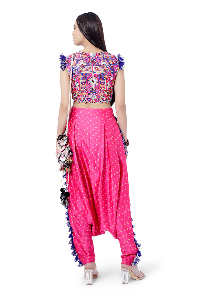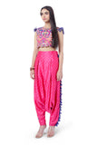Designer Payal Singhal: Hot pink colour georgette embroidered choli and bandhani silk low crotch pant with tassels