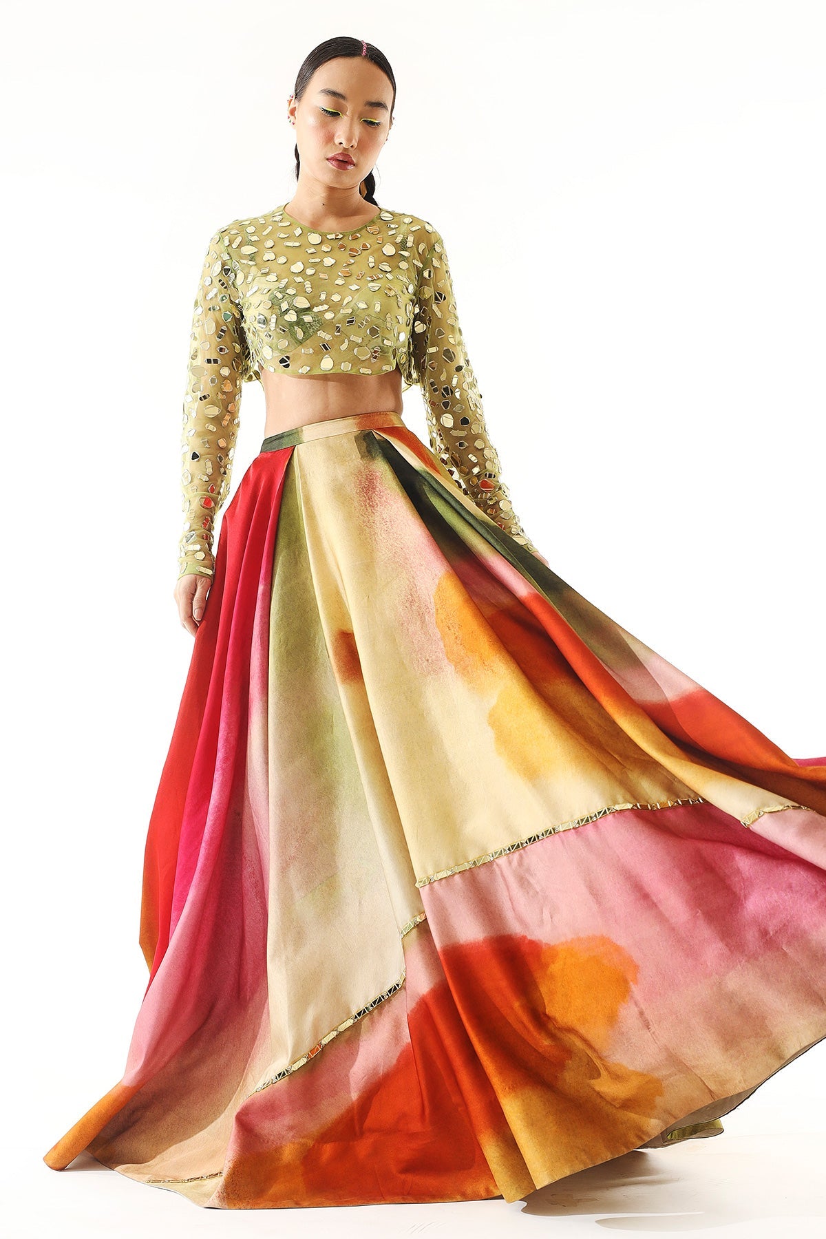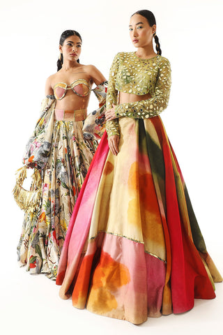 Embroidered Blouse With Printed Organza Satin Lehenga