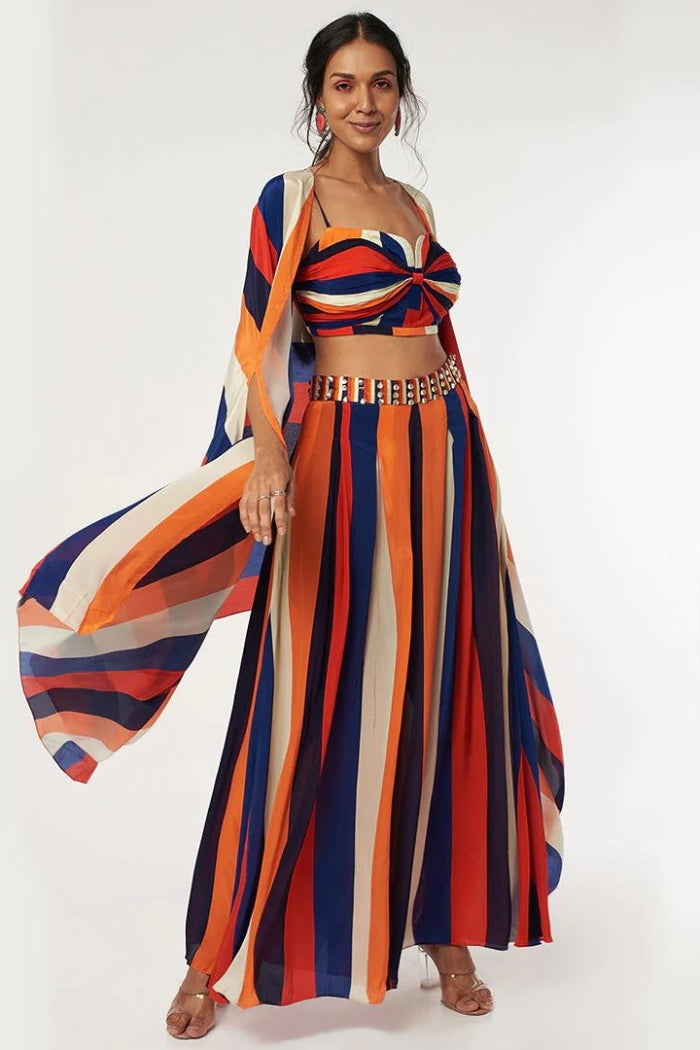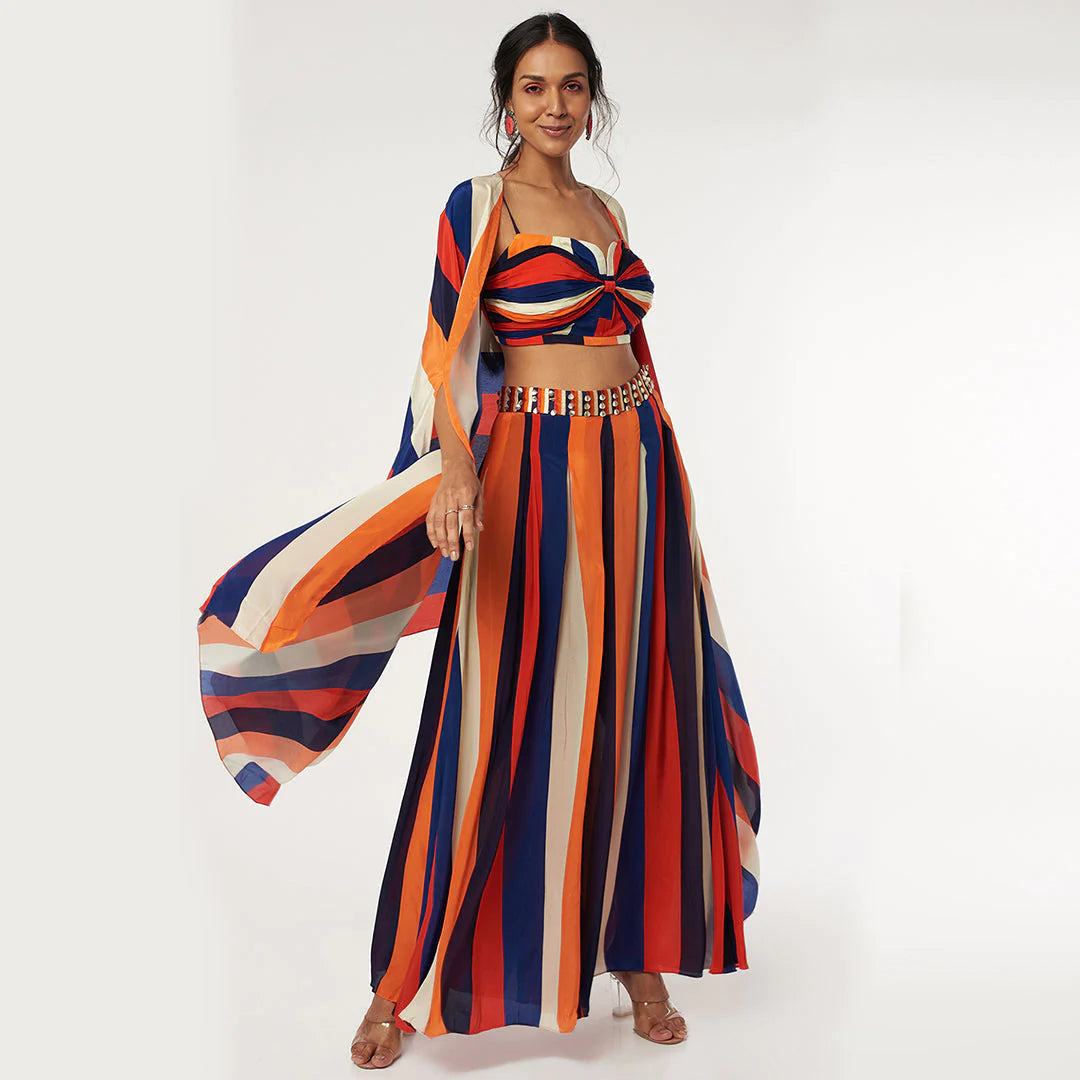 RASA STRIPES PRINT BIKINI BUSTIER WITH PLEATED PANTS AND CAPE