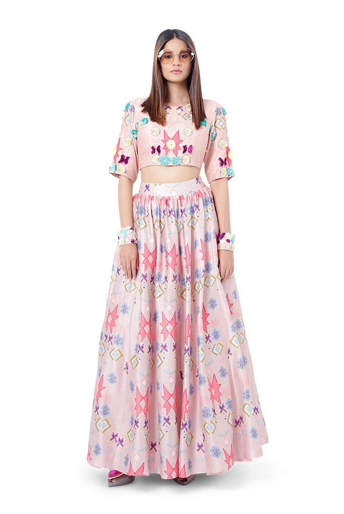 Pink Ikat Star print silkmul embroidered choli with silkmul lehenga and net embroidered dupatta with printed piping and colourful tassels