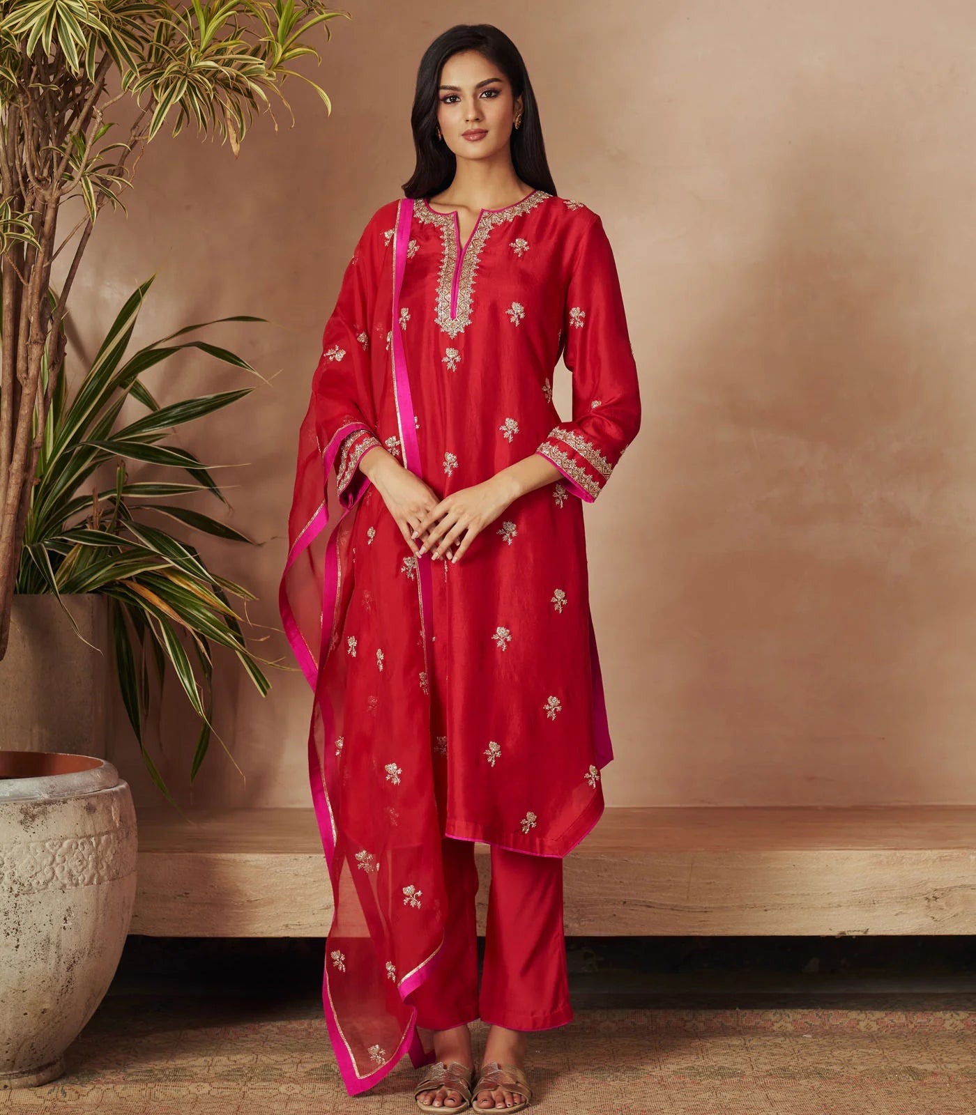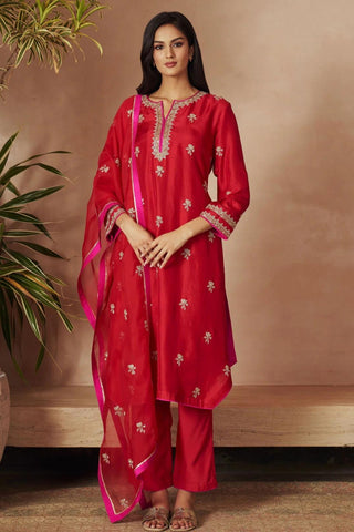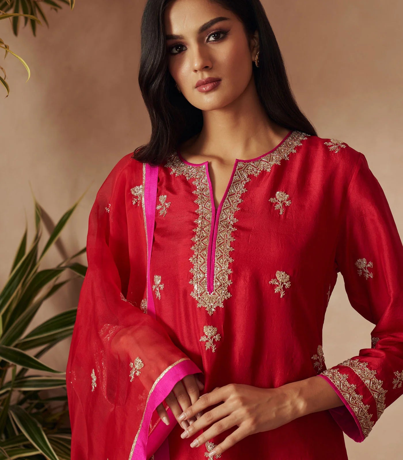 RED DUPION SILK FLOWER ZARDOZI BOOTIES KURTA PAIRED WITH COTTON SILK PANT AND RED ORGANZA BUTTIE EMBROIDERED DUPATTA