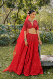 Vintage red floral embroidered skirt with pockets and sparkly beaded waist; hand embroidered, elbow length sparkled rawsilk blouse, gold belt embroidered in glass beads, handwoven organza dupatta embroidered with tiny red flowers