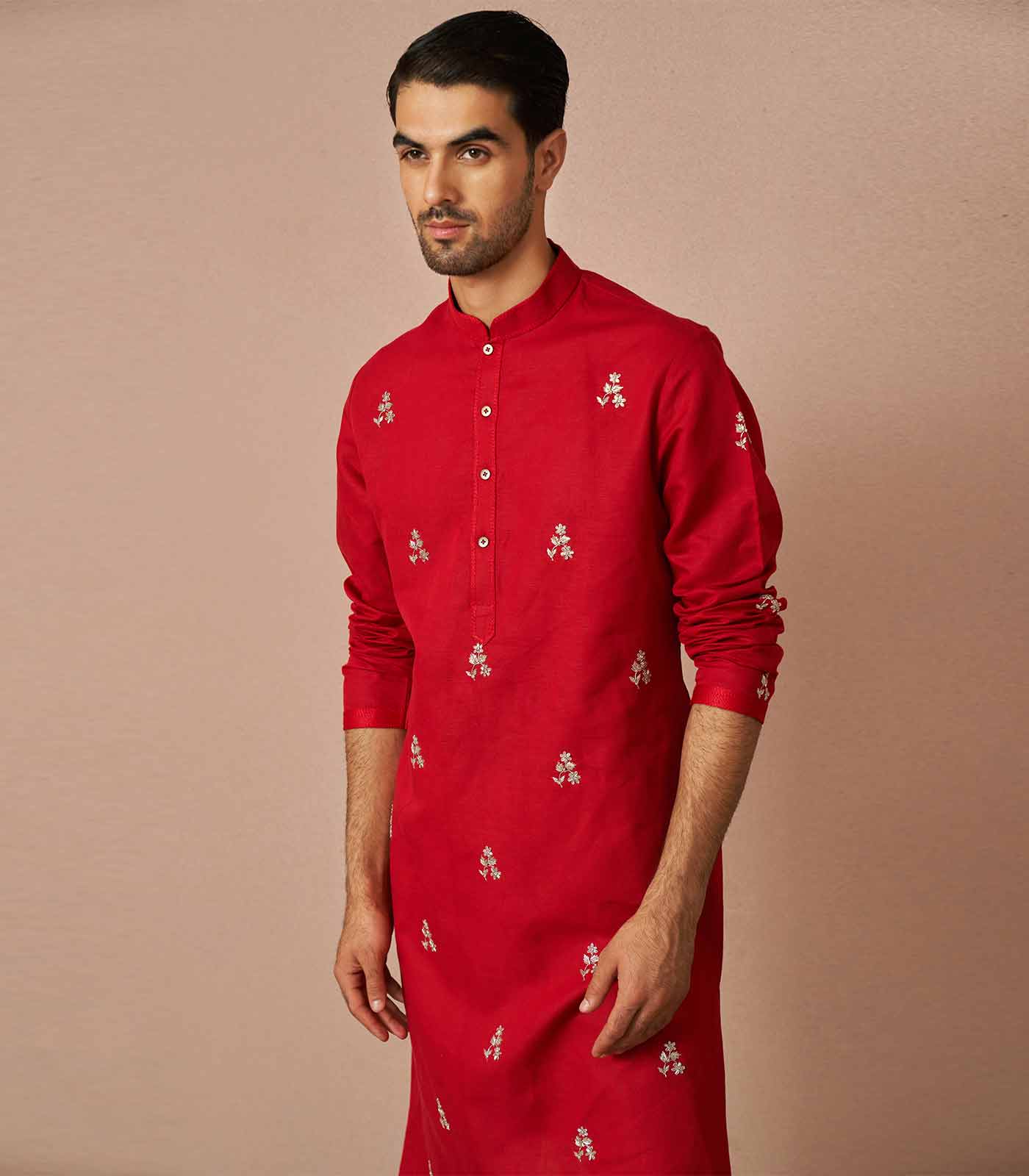 With the color of love, this red linen kurta is crafted with beautiful Zardozi booti embroidery, it is further coupled with an off white stretch cotton churidaar to add to the enchanting look.