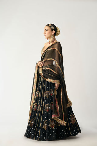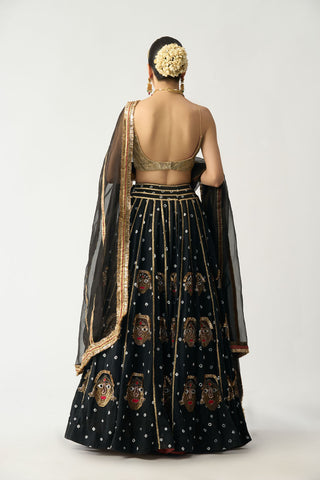Intricate Katputli Dolls Embroidered on Hand Done Bandhani Linen Lehenga With a Lampi Blouse and Silk Organza Dupatta With Lampi and Block Printed Strips.