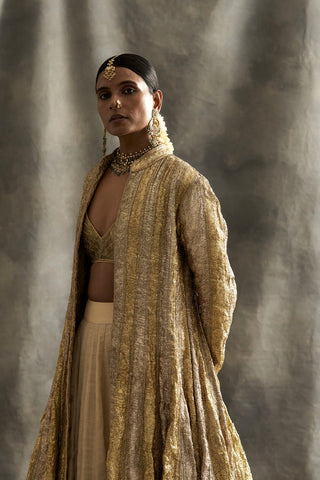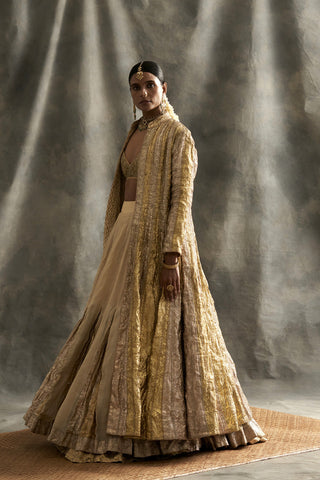 Silver Gold Striped Ghera Lampi Jacket With Gold Chanderi, Metallic Godet Inserts Double Tier Skirt. The Blouse Is Made Out Of Gold Lampi